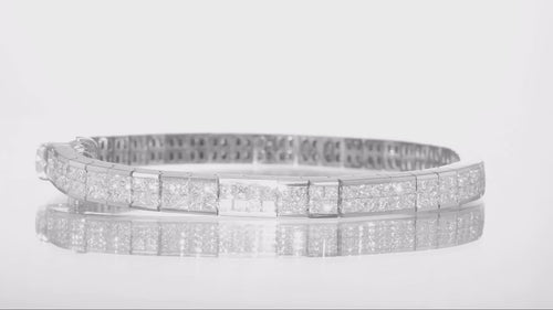 Unit price / perA stylish collection color Princess shape Tennis bracelet, with 6.45cts diamonds, set in a chanel setting, featuring clusters of 4 diamonds in each link. Mounted in 18K white gold, and clarity graded by our in house GIA GG graduate Gemologist.