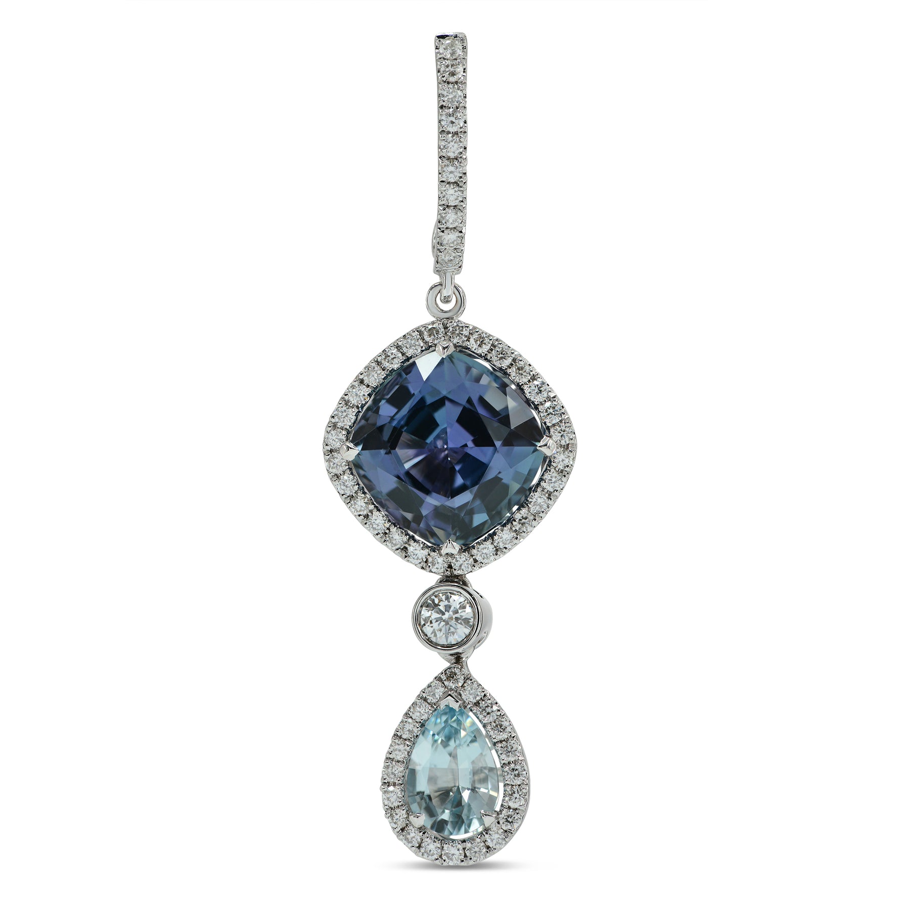 An extraordinary tanzanite and aquamarine diamond drop earrings mounted in 18k white gold. The Tanzanite cushions weigh 5.60Ct TW and the Aquamarine apears weigh 0.75Ct TW. They are beautifully complimented with collection color white round brilliants weighing 0.65Ct TW.�