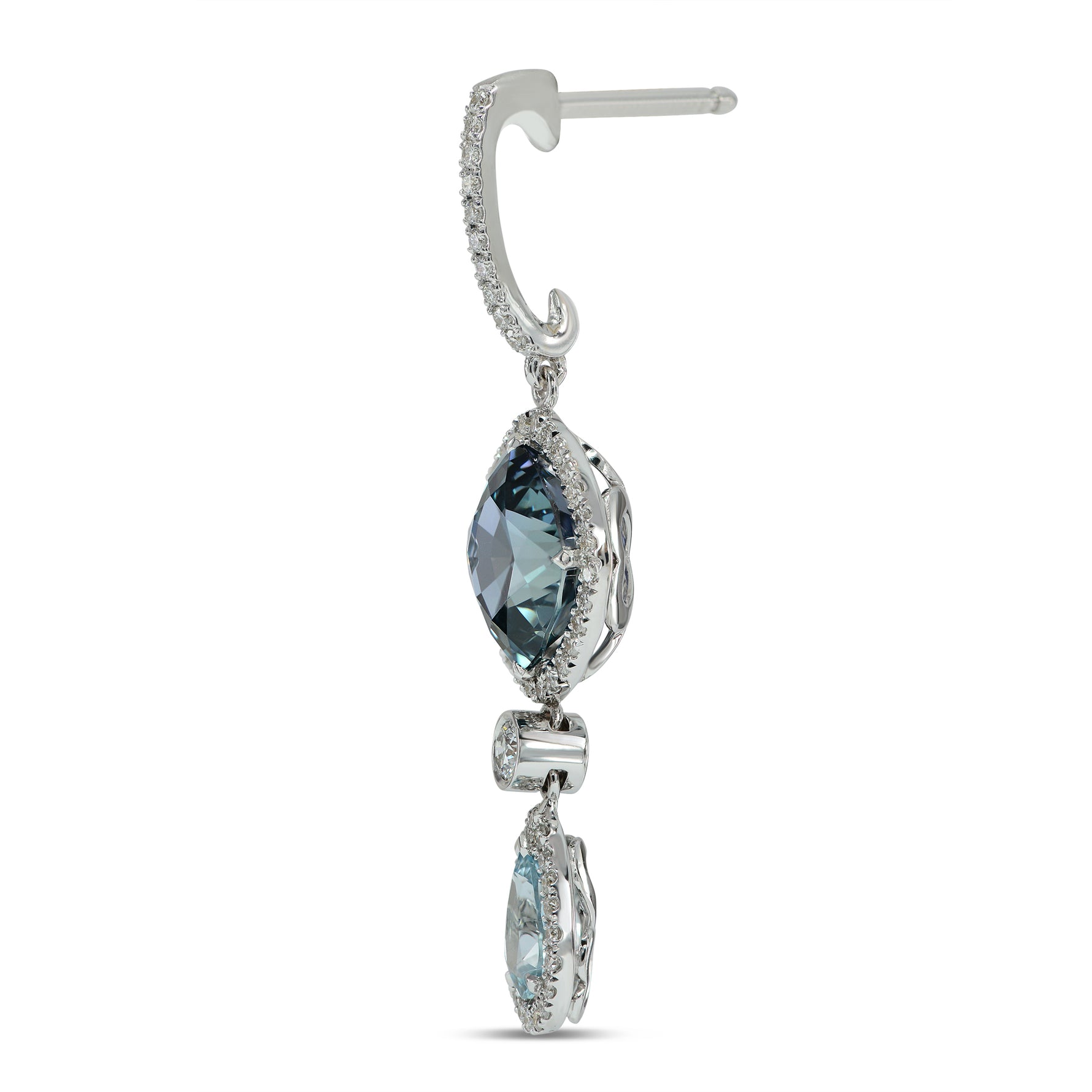 Unit price / perAn extraordinary tanzanite and aquamarine diamond drop earrings mounted in 18k white gold. The Tanzanite cushions weigh 5.60Ct TW and the Aquamarine apears weigh 0.75Ct TW. They are beautifully complimented with collection color white round brilliants weighing 0.65Ct TW.�