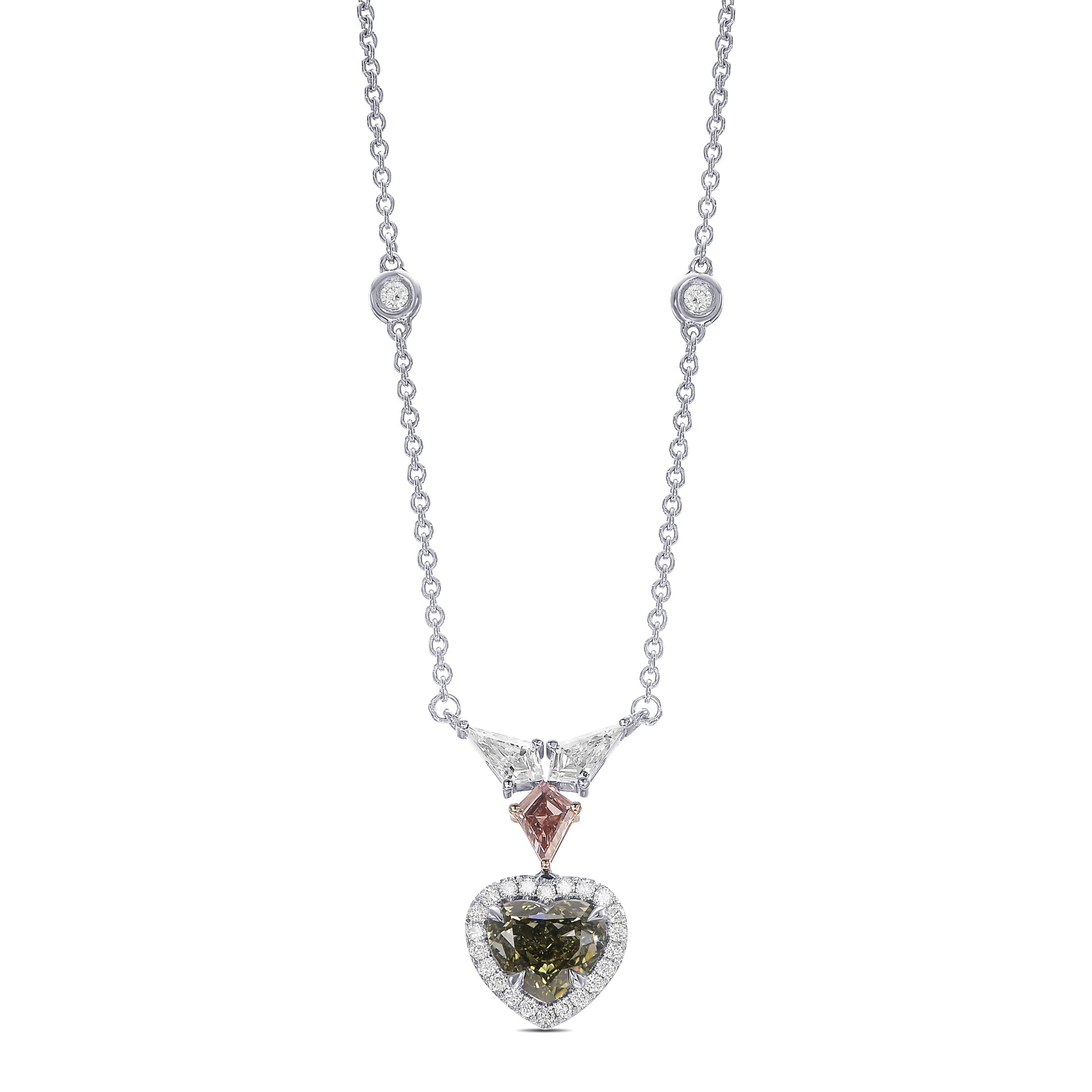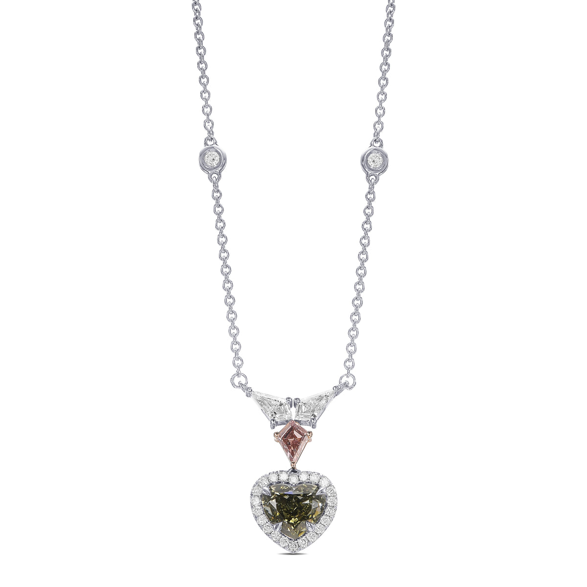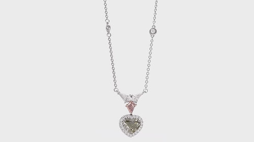 This exquisite pendant showcases a stunning 1.23-carat Chameleon heart diamond, GIA-certified and framed by a luminous pave halo of collection brilliants. The design elegantly combines 18K white and rose gold, creating a harmonious contrast that enhances the center stone's radiance. A distinctive fancy brownish orangy pink kite diamond crowns the composition, flanked by two D-color kite diamonds arranged in a refined wing motif. The result is a sophisticated drop pendant that balances bold color with timeless elegance, perfect for those who appreciate distinctive gemstone artistry.