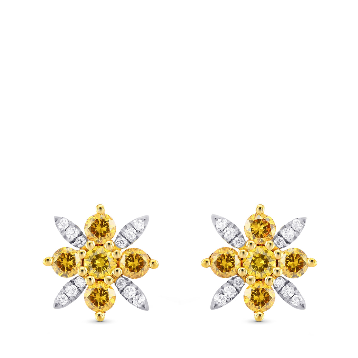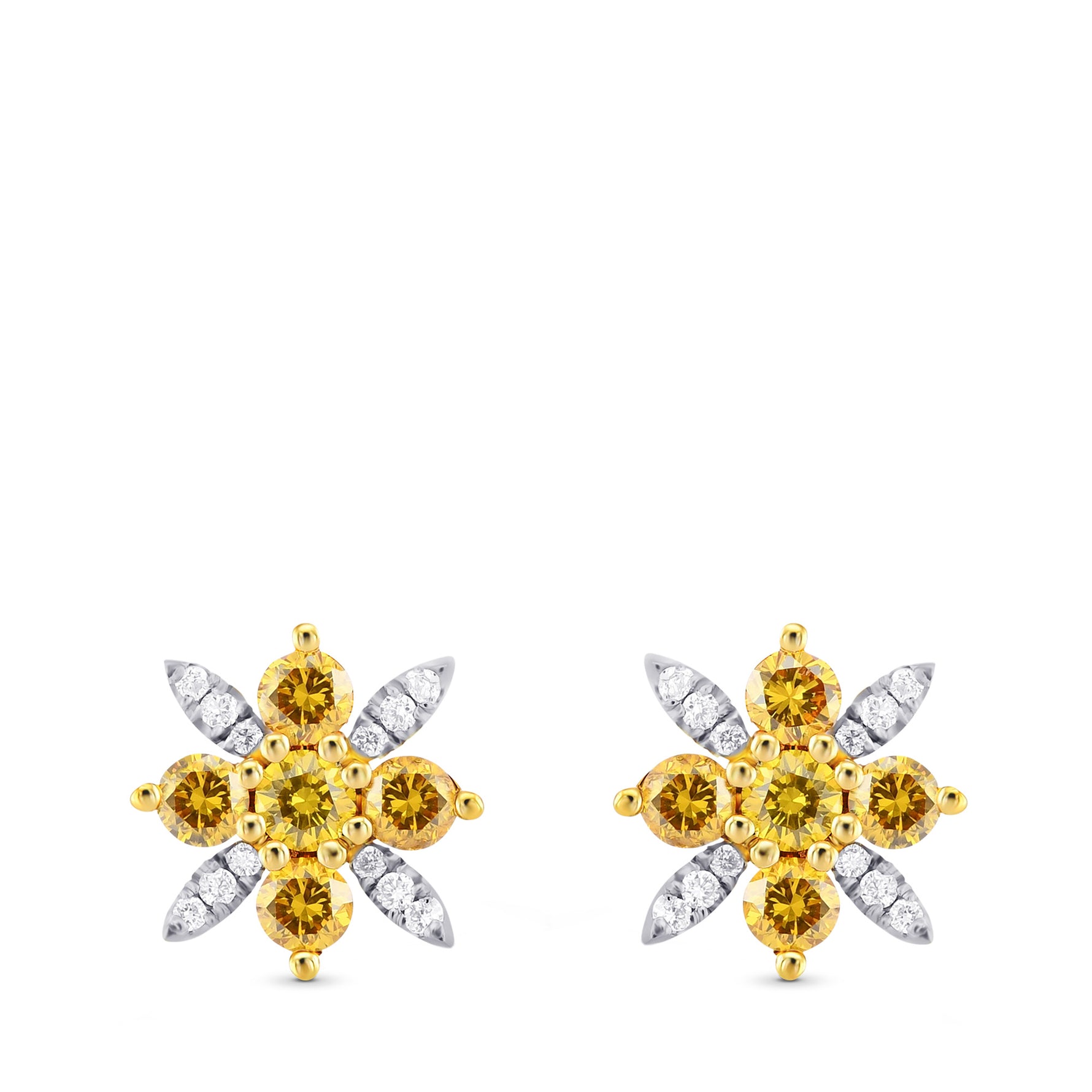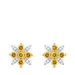 A stylish pair of fancy vivid orange yellow and white diamond pave earrings, featuring a floral motif and mounted in 18K white and yellow gold.