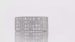 A lovely four row princess diamond band ring featuring 1.98cts collection color diamonds styled in an invisible setting and accented by milgrain edging. The ring is mounted in 18K white gold.