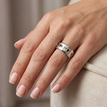 Trauring, gefertigt aus 18K Weißgold (mit palladiumhaltiger Legierung). Der Ring ist 8,0 mm breit und mit 6 schwarzen (behandelten) runden Brillanten in Rotgold eingefasst, mit einer Rille um die Mitte des Rings.