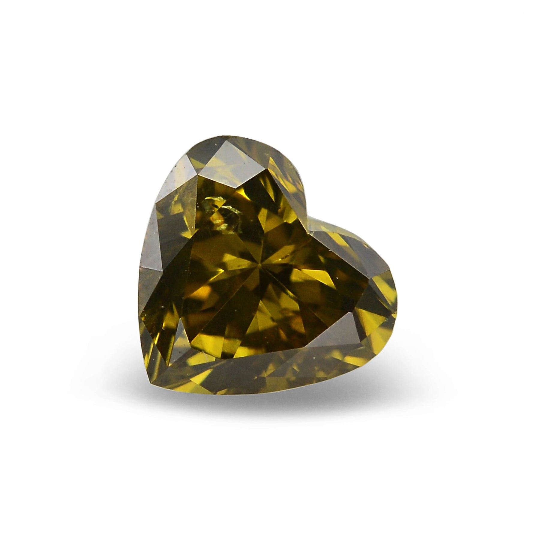 0.55 carat, Fancy Deep Brownish Greenish Yellow, Heart shape Diamond with SI1 clarity, graded by GIA. A wonderful Yellow Diamond with a captivating Olive color and full luster. Clarity graded by our in house GIA GG Graduate Gemologist.