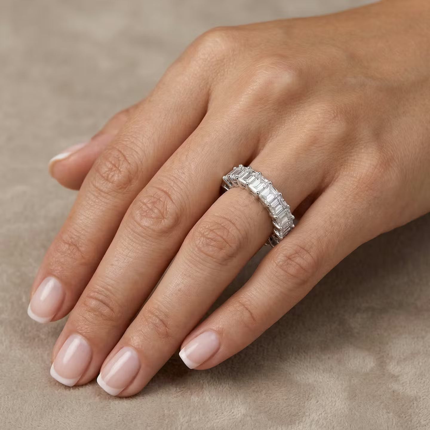 Di superba brillantezza e presenza, un classico anello eternity completo, incastonato con diamanti a taglio smeraldo incolori della collezione, con un design a griffe condivise, e montato interamente in platino. L'anello nuziale o il regalo di anniversario perfetto.
