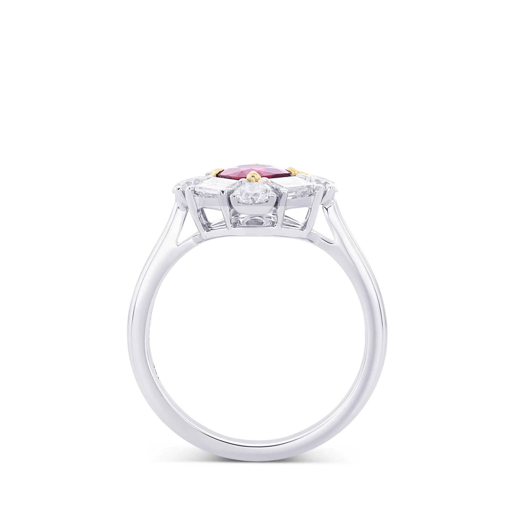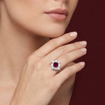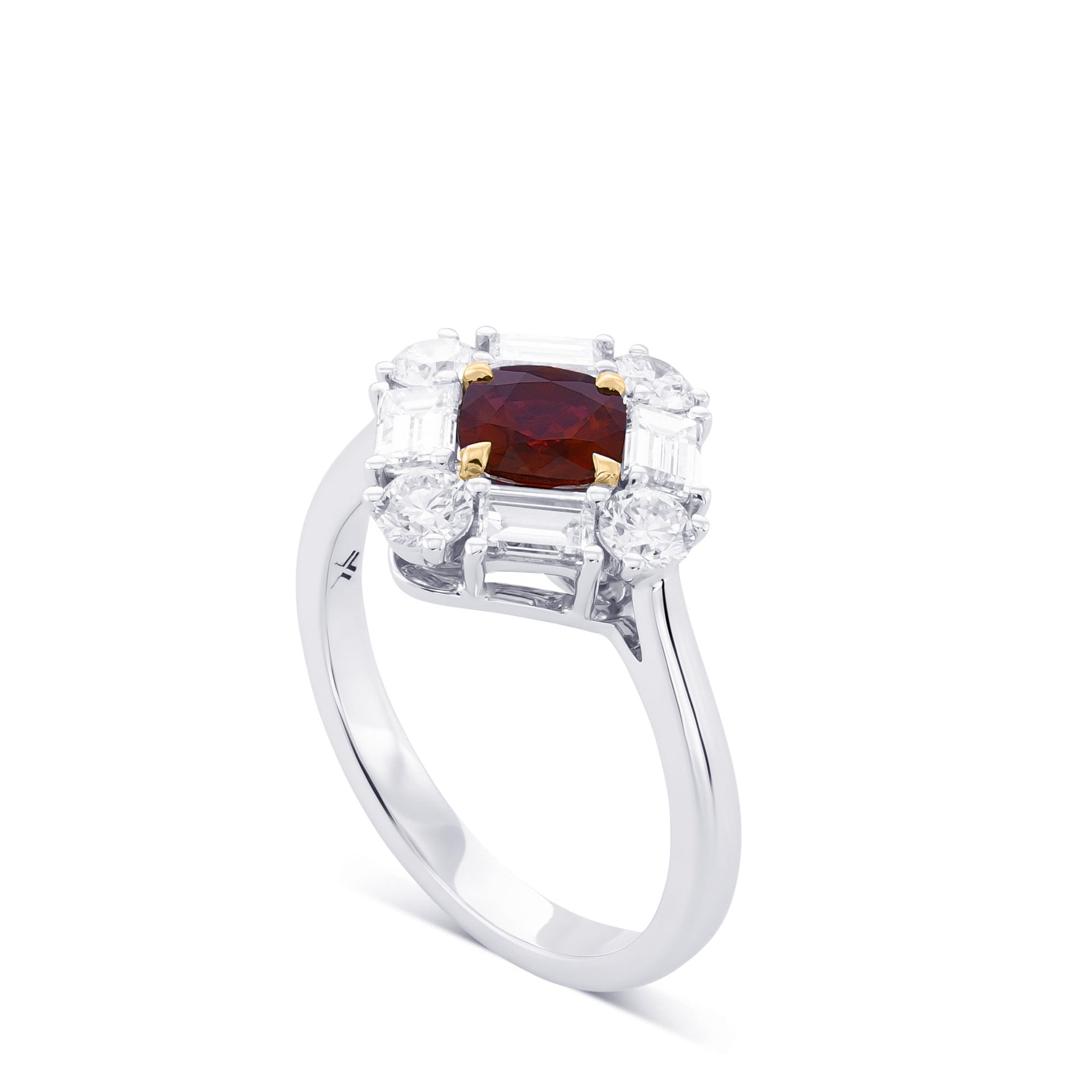 A beautiful cushion red ruby halo ring, with a center stone weighing 0.60cts. The ring features collection color brilliants and baguettes, styled in a contemporary shared prong halo, and the ring is mounted in 18K white and rose gold.