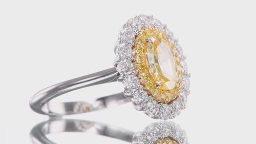 Doppelter Halo-Ring, der innere Halo ist mit ausgefallenen, intensiven Gelbtönen besetzt, der äußere Halo mit farblosen runden Brillanten. Erhältlich in 18 Karat Gold