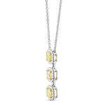 Of grace and elegance.. an extraordinary diamond drop pendant, featuring 3 fancy intense yellow cushion diamonds, total weight 1.57cts. Mounted in 18K white and yellow gold, each diamond is beautifully complimented with collection color brilliants styled in an open pave halo.