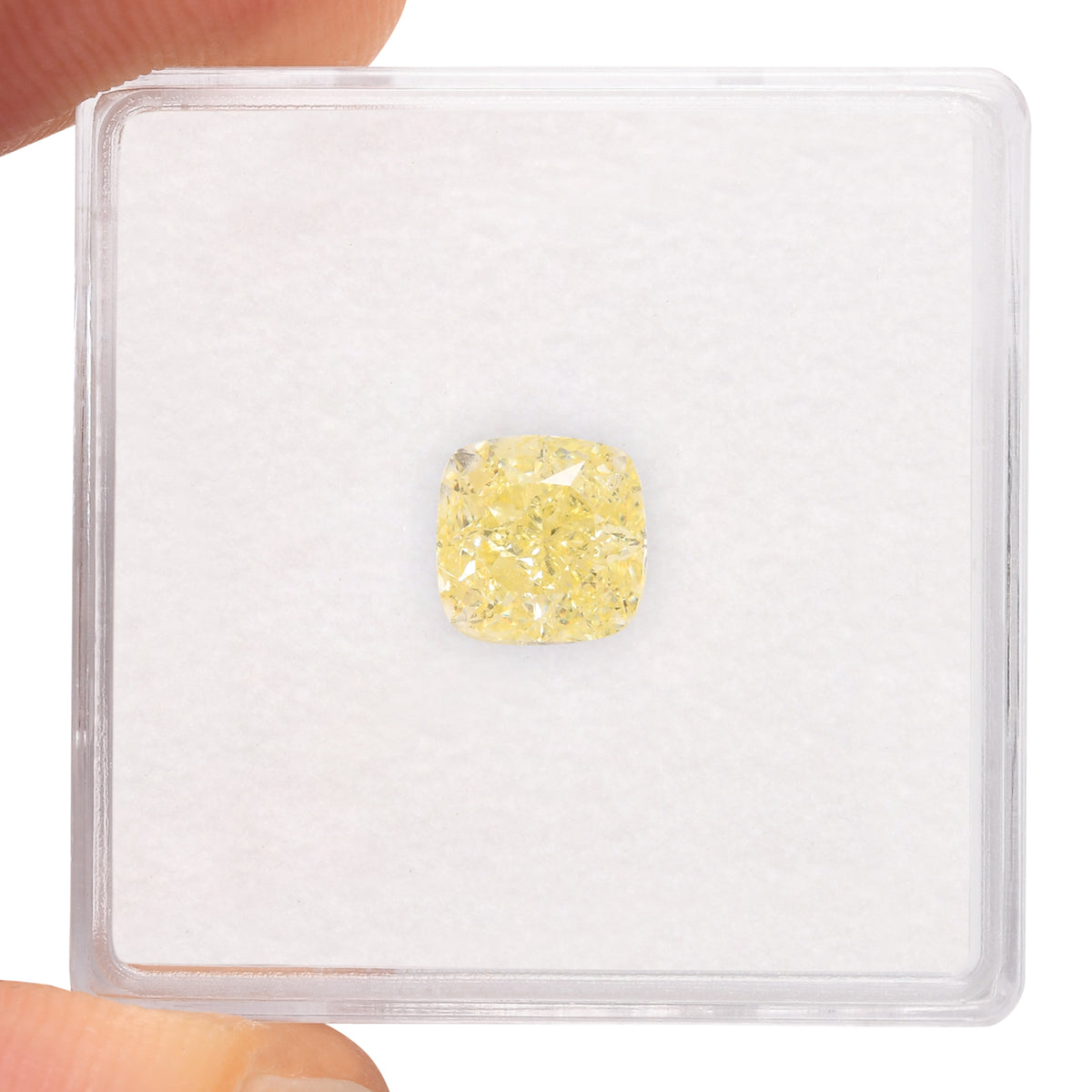 1.52 carat, Fancy Yellow, cushion diamond with VS2 clarity, graded by GIA. The stone has Excellent polish and Very Good symmetry.