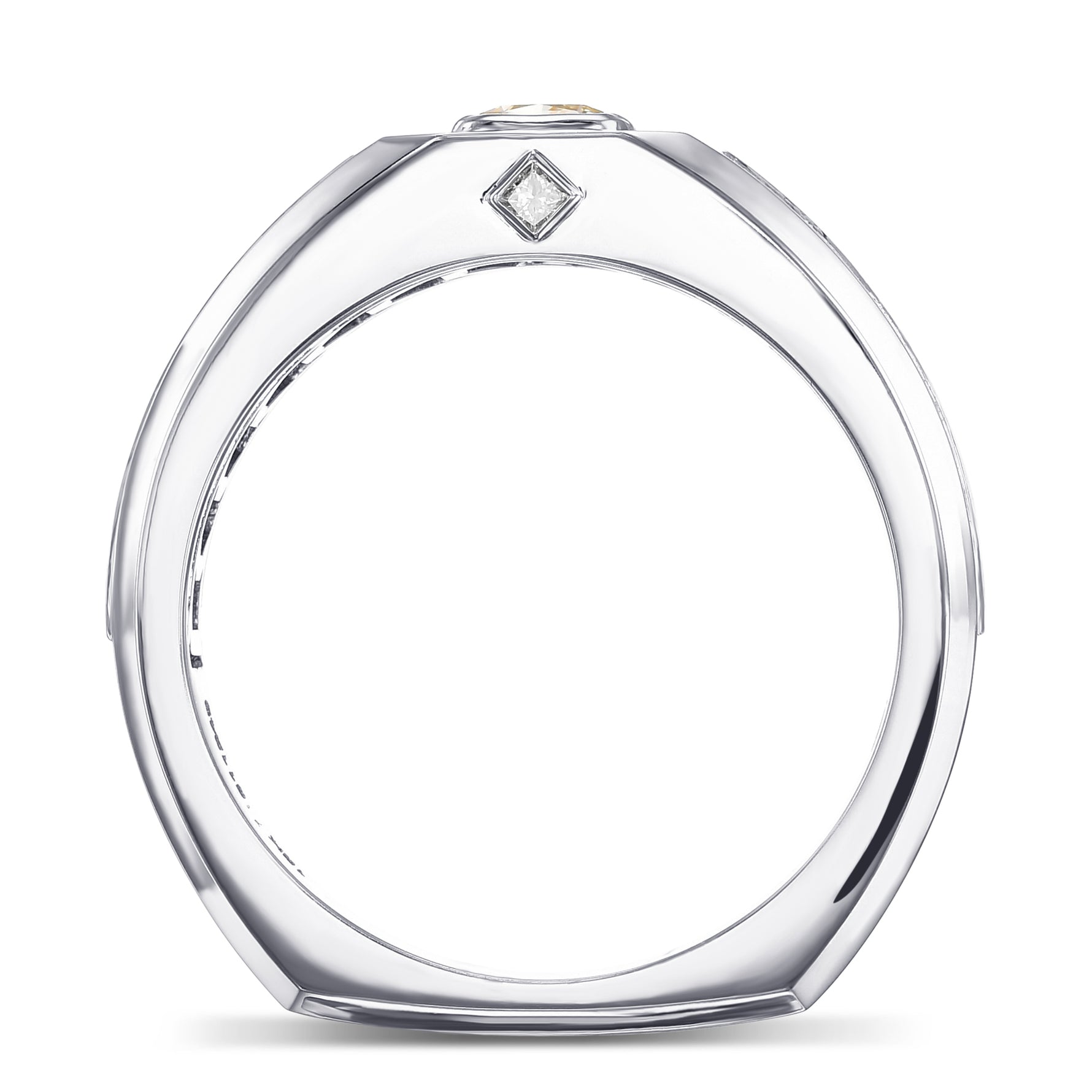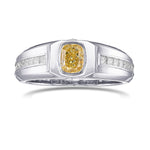 A stunning fancy yellow cushion diamond men's ring, with a center diamond weighing 1.12ct and certified by GIA. The diamond is accented by collection color Princess side stone diamonds styled in a Channel setting, and the ring is mounted in18K white and yellow gold.