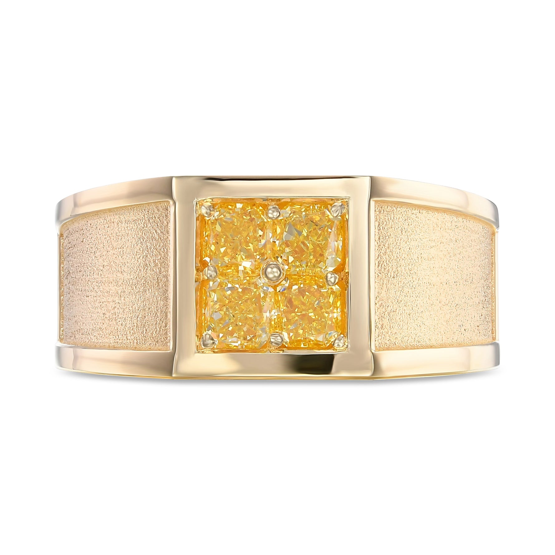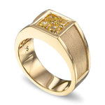 Custom made men's ring set with 4 fancy yellow radiant diamonds weighing 1.02cts, total weight. Mounted in brushed 18K yellow gold. Color and clarity graded by our in house GIA GG graduate gemologist.