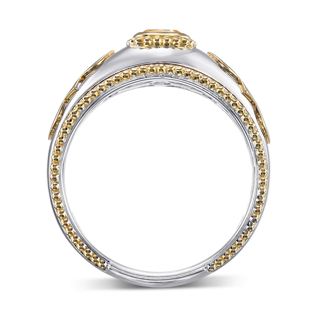 Grundpreis / proA stunning men's ring with a fancy intense yellow cushion center stone, weighing 1.01cts and certified by GIA. The diamond is set in a bezel setting, with decorative motifs accenting the band, and a gold bead trim along the shank. The ring is mounted in 18K white and yellow gold.
