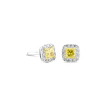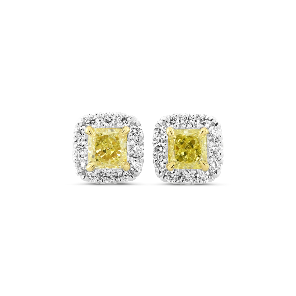 These Fancy Yellow Radiant Halo Diamond Earrings showcase vibrant fancy yellow diamonds, set within an open pave diamond halo that enhances their brilliance. Expertly crafted in a harmonious blend of 18K white and yellow gold, these earrings deliver a sophisticated contrast and timeless elegance.