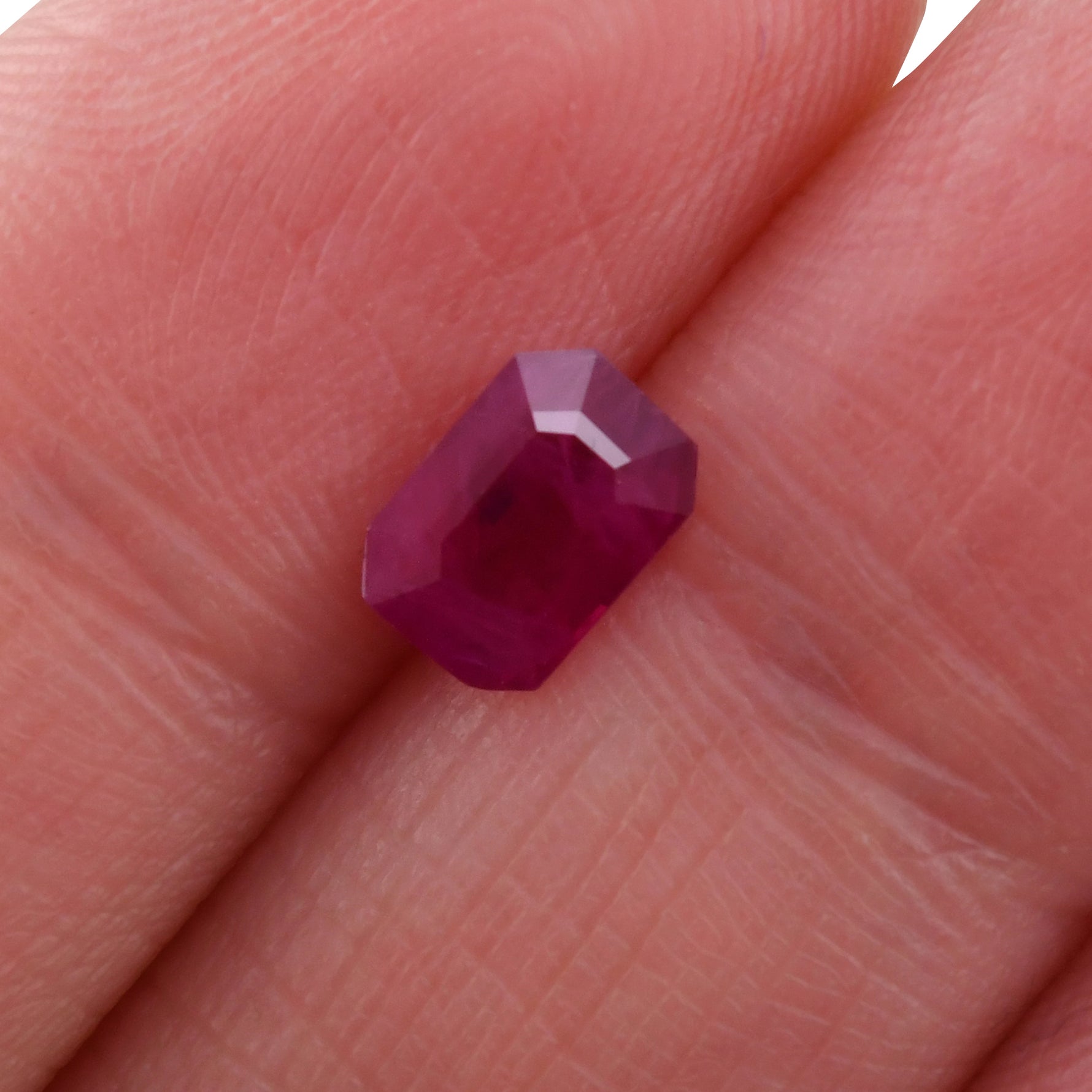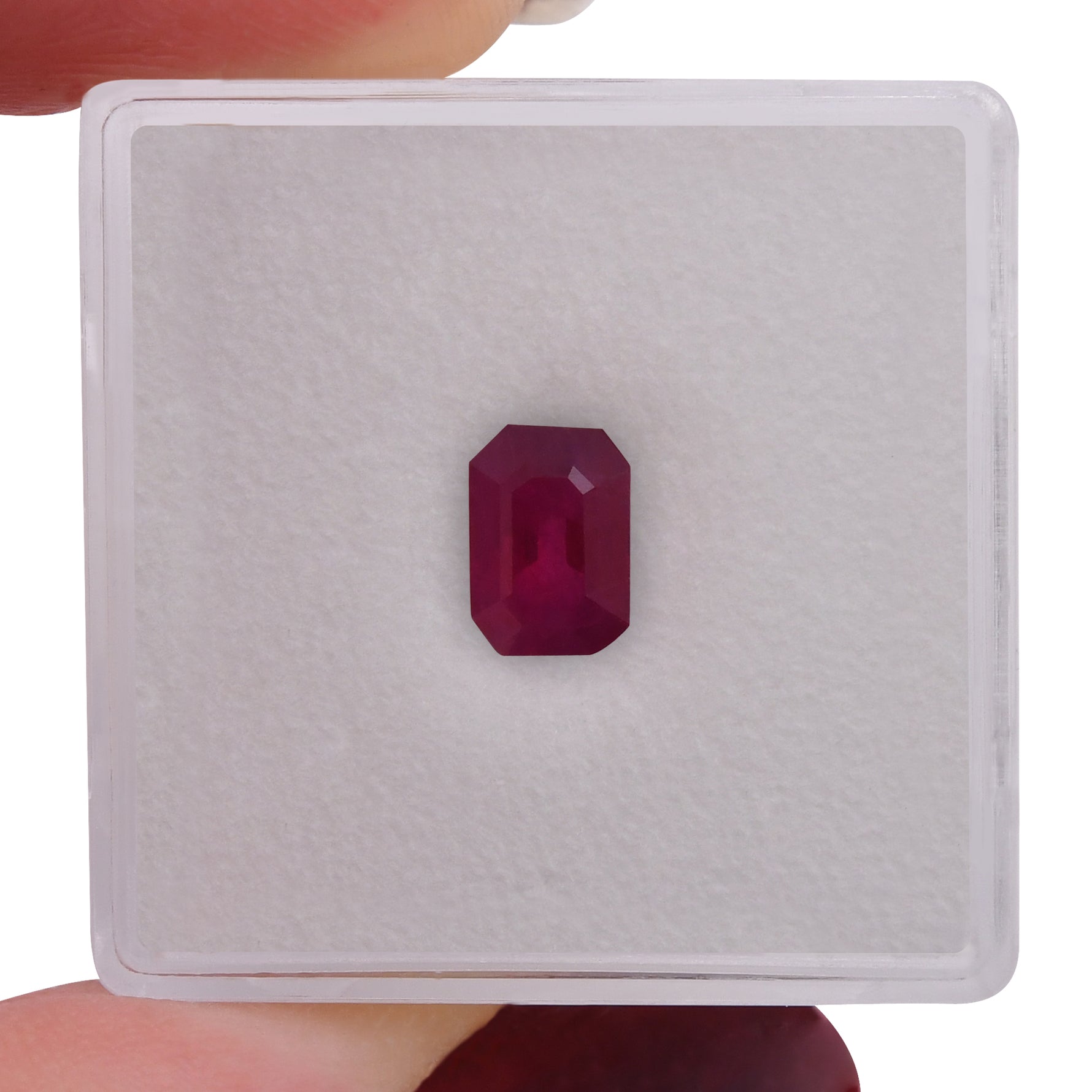 Ein prächtiger 1,03 Karat Mosambik-Rubin im Smaragdschliff, der sich durch seinen tiefen, betörenden Rotton auszeichnet. Dieser außergewöhnliche Edelstein bietet die satte Sättigung und Klarheit, die hochwertige Rubine ausmachen, was ihn zu einer begehrten Wahl für raffinierte Schmuckdesigns macht.