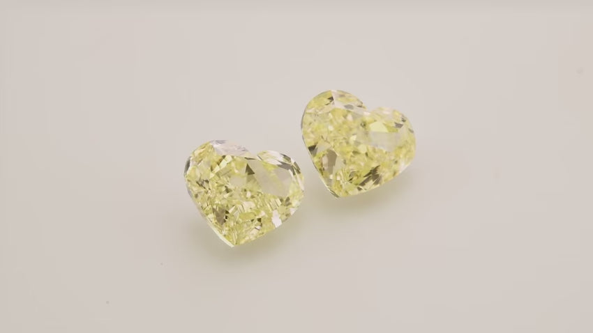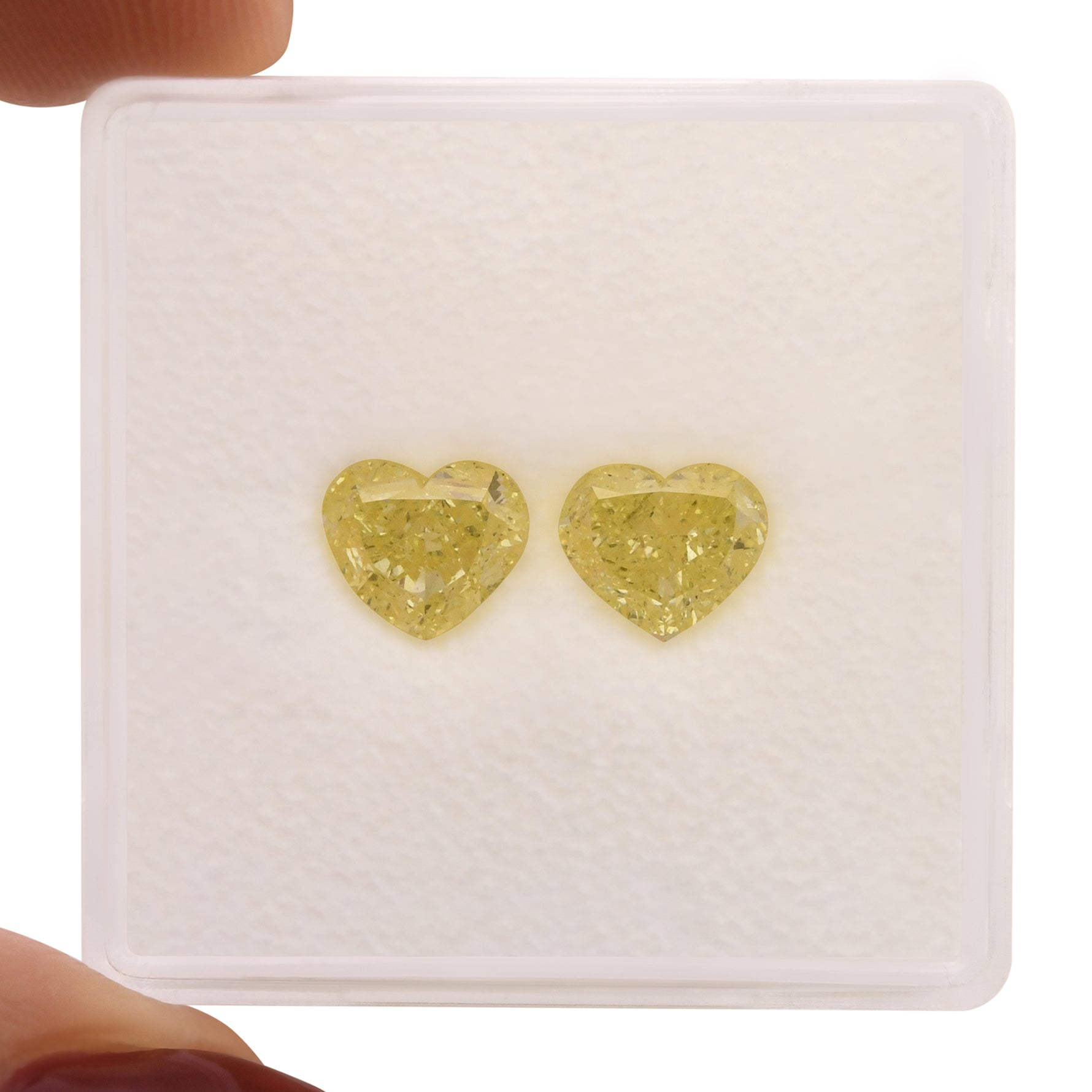 This stunning pair of 2.02-carat heart-shaped diamonds features a captivating Fancy Light Yellow hue and VS1 clarity, certified by the GIA. Their warm glow and romantic cut make them perfect for creating unforgettable jewelry pieces that stand out with elegance and distinction.