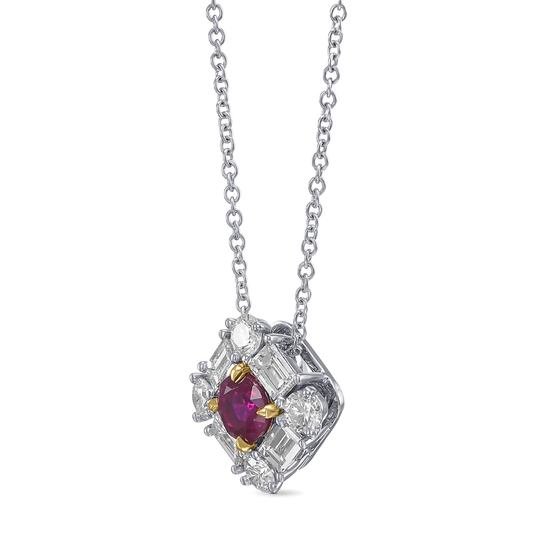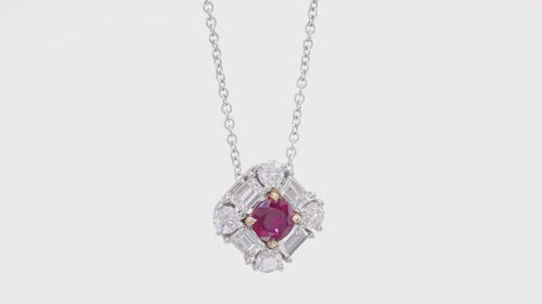A beautiful red ruby and diamond pendant, with a center brilliant shape gemstone weighing 0.61cts. The ruby is accented by collection color brilliants and baguettes styled in a shared prong halo, and is mounted in 18K white and yellow gold. Color and clarity graded by our in house GIA GG Graduate Gemologist.