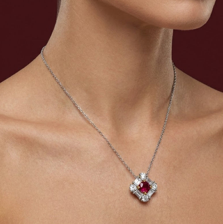 Grundpreis / proA beautiful red ruby and diamond pendant, with a center brilliant shape gemstone weighing 0.61cts. The ruby is accented by collection color brilliants and baguettes styled in a shared prong halo, and is mounted in 18K white and yellow gold. Color and clarity graded by our in house GIA GG Graduate Gemologist.