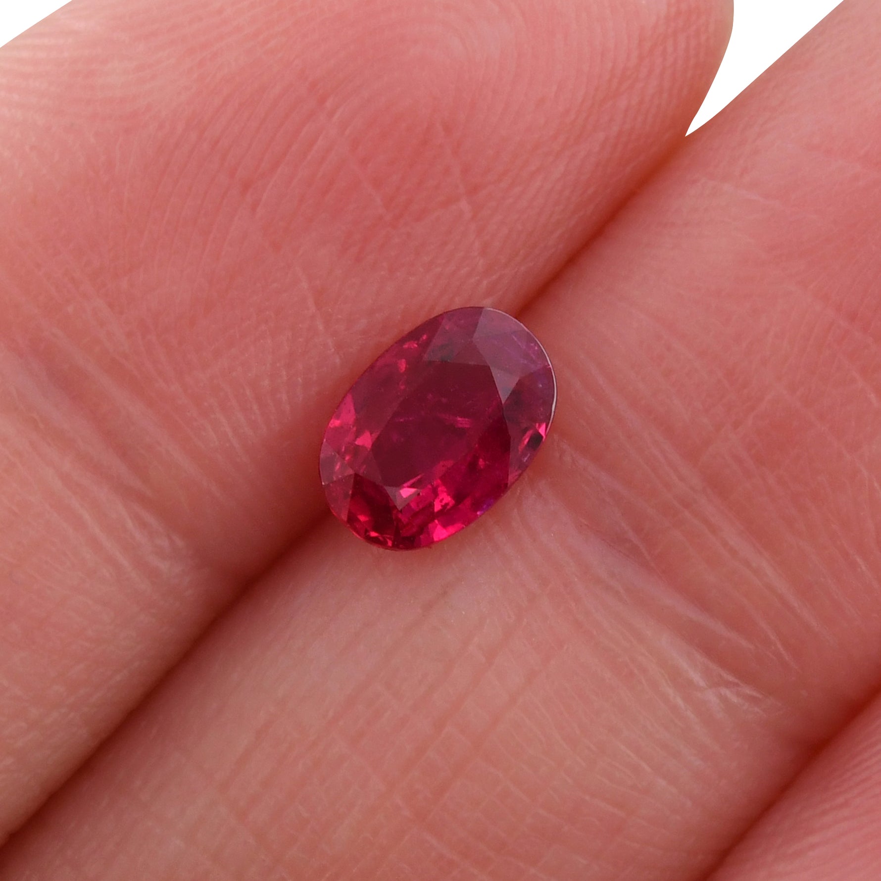 Dieser 0,85 Karat Mosambik-Rubin besticht durch eine fesselnde rote Farbe im raffinierten Ovalschliff. Dieser Edelstein stammt aus den berühmten Rubinenminen Mosambiks und ist ein Beispiel für die tiefe, gesättigte Farbe, die anspruchsvolle Sammler suchen.