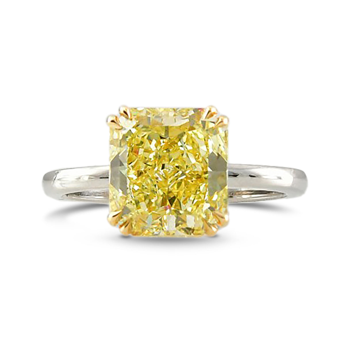 Ein klassischer Fancy Yellow Radiant Solitaire Ring mit einem Mittelstein von 3,41 Karat, zertifiziert von GIA. Der Diamant ist in einer doppelten Krappenfassung gefasst und besteht aus Platin und Gelbgold.