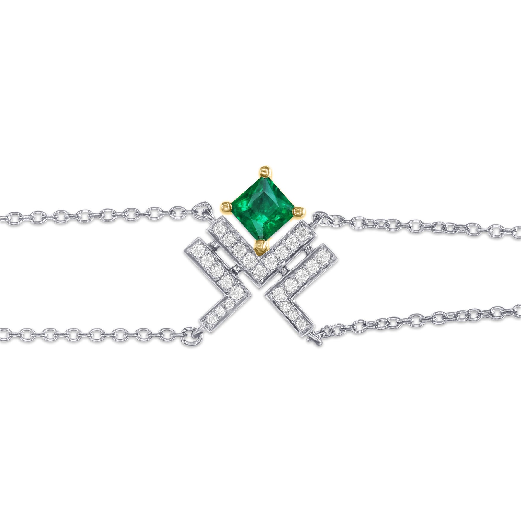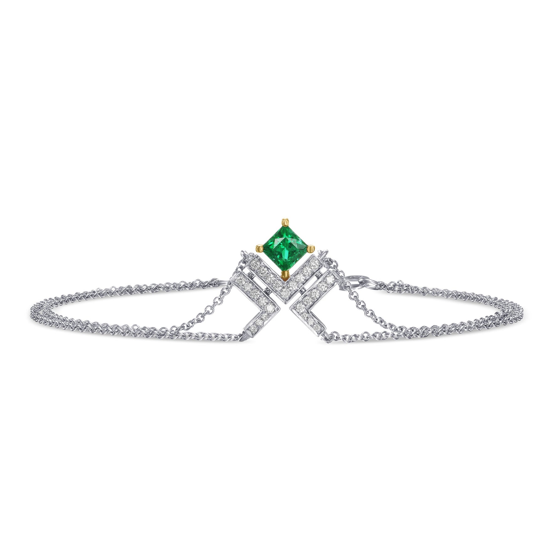 A refined emerald bracelet in LEIBISH’s signature design, mounted in 18K white gold and highlighted by channel-set Fancy Color brilliants.