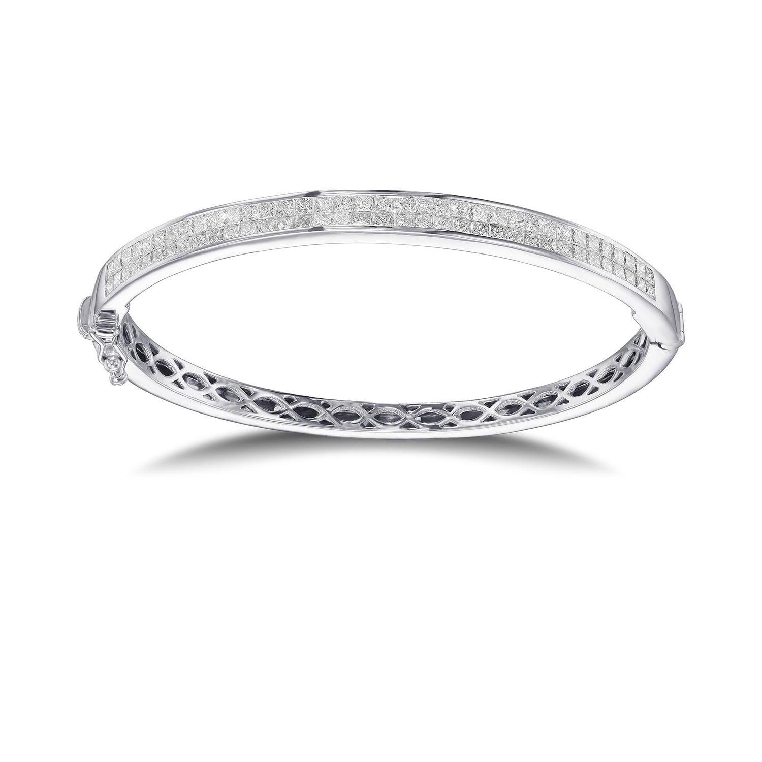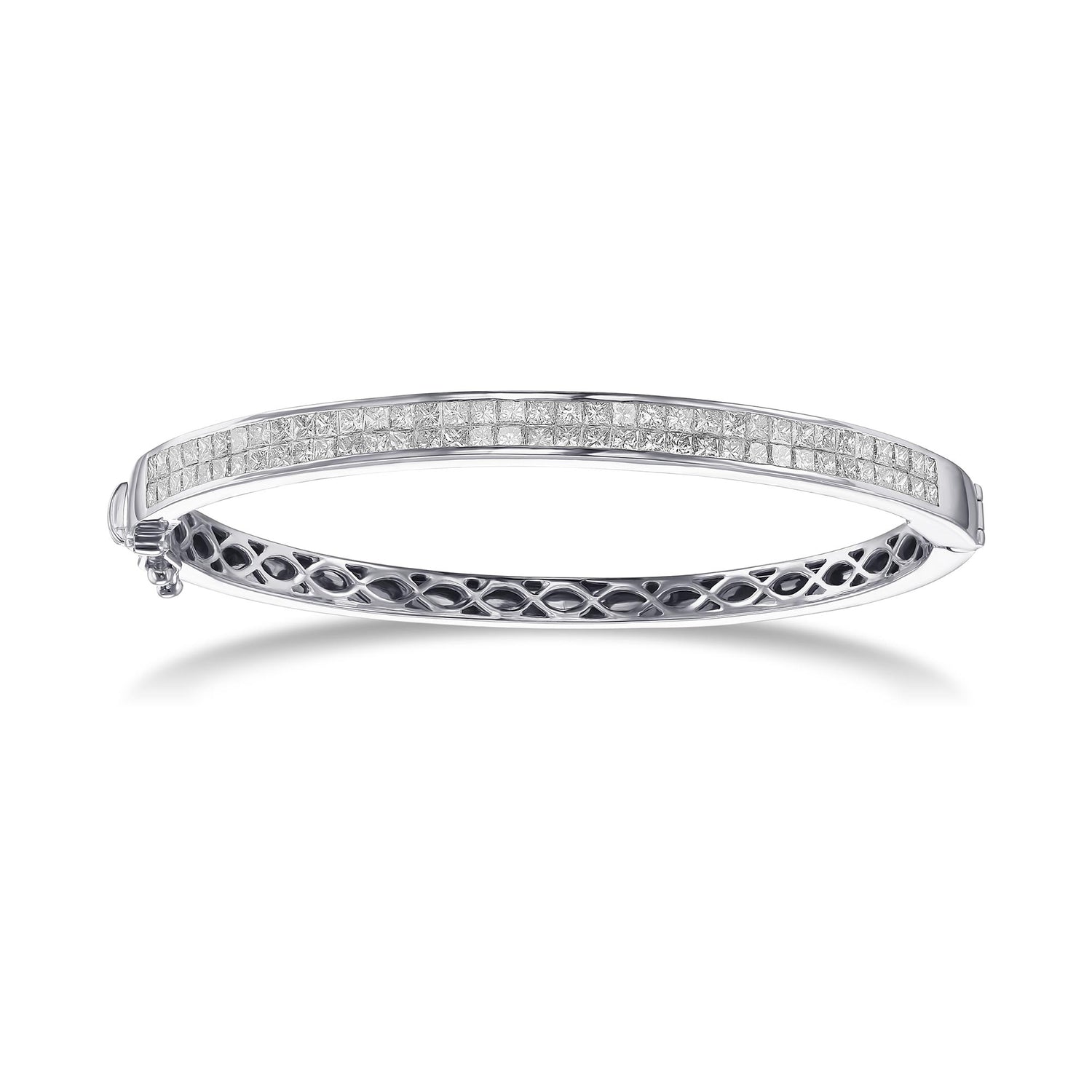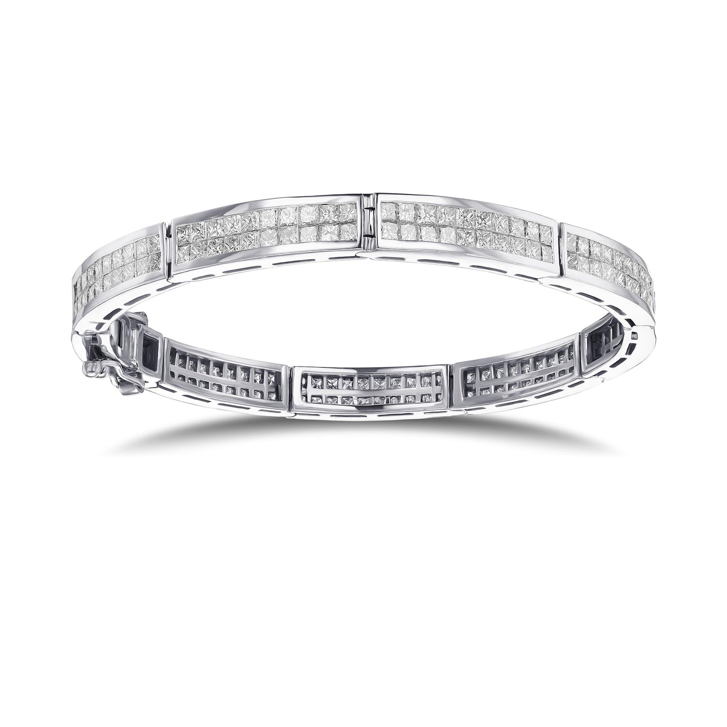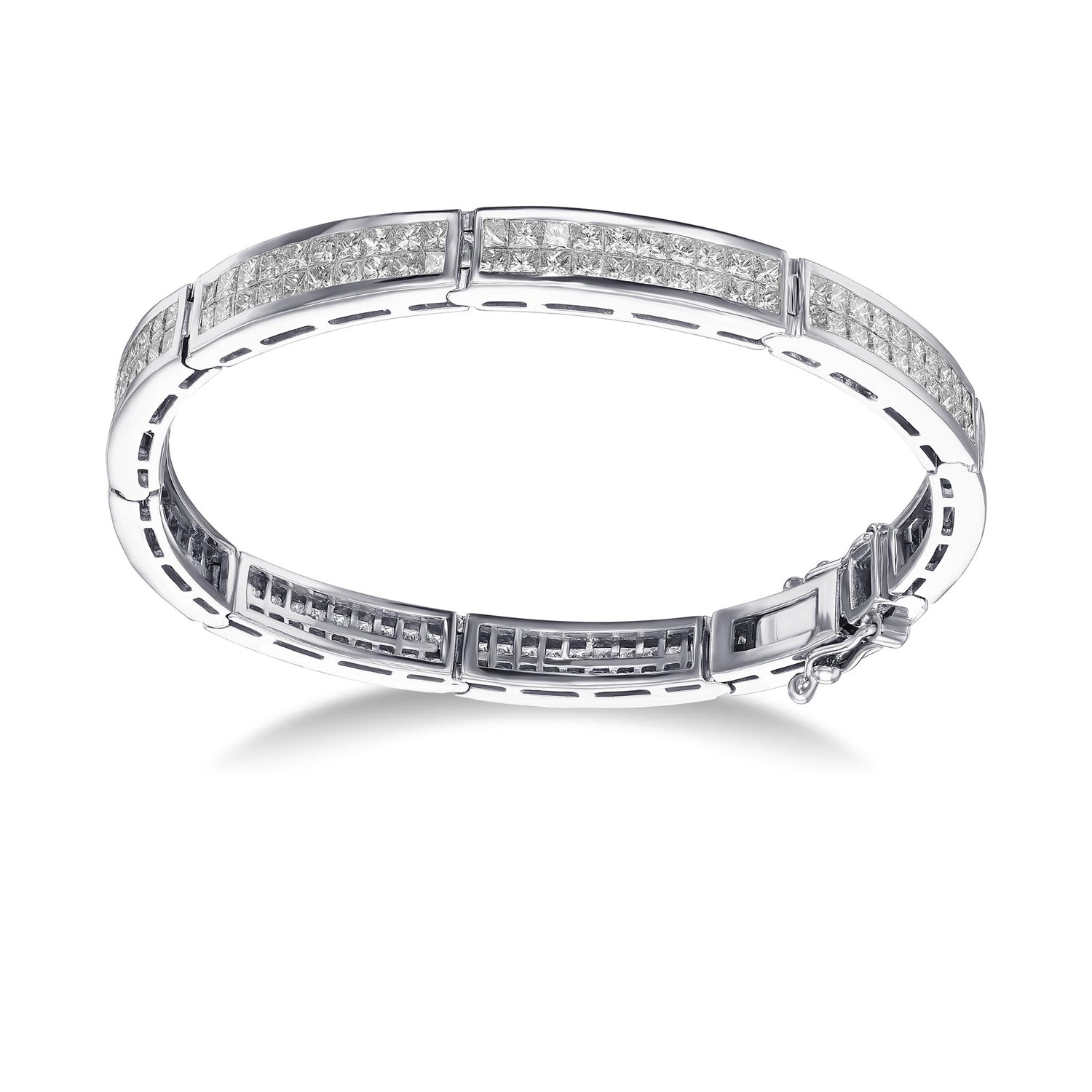 Grundpreis proA beautiful collection color Princess cut diamond bracelet, with 7.53cts styled in a channel setting in a bangle style bracelet. Mounted in 18K white gold, with clarity and color graded by our in house GIA GG Graduate Gemologist.