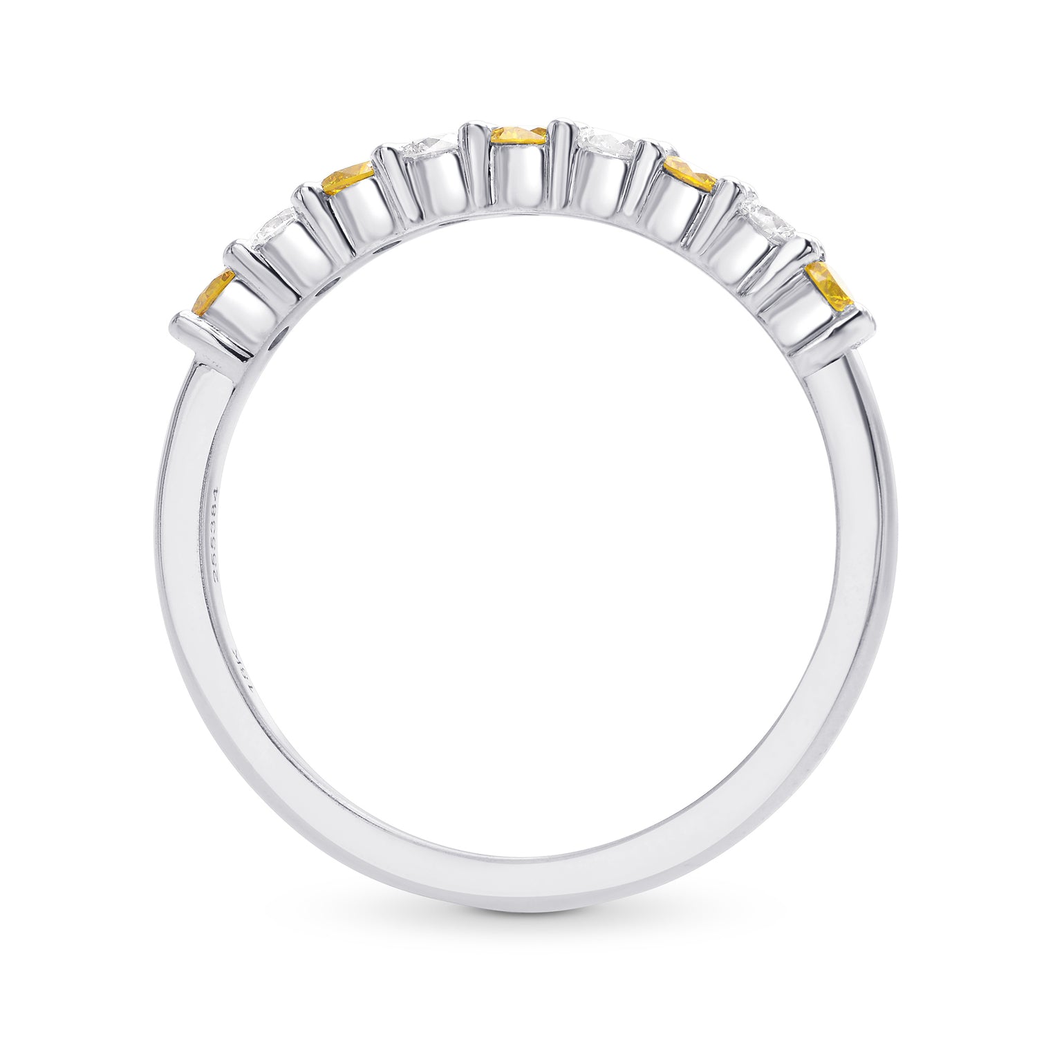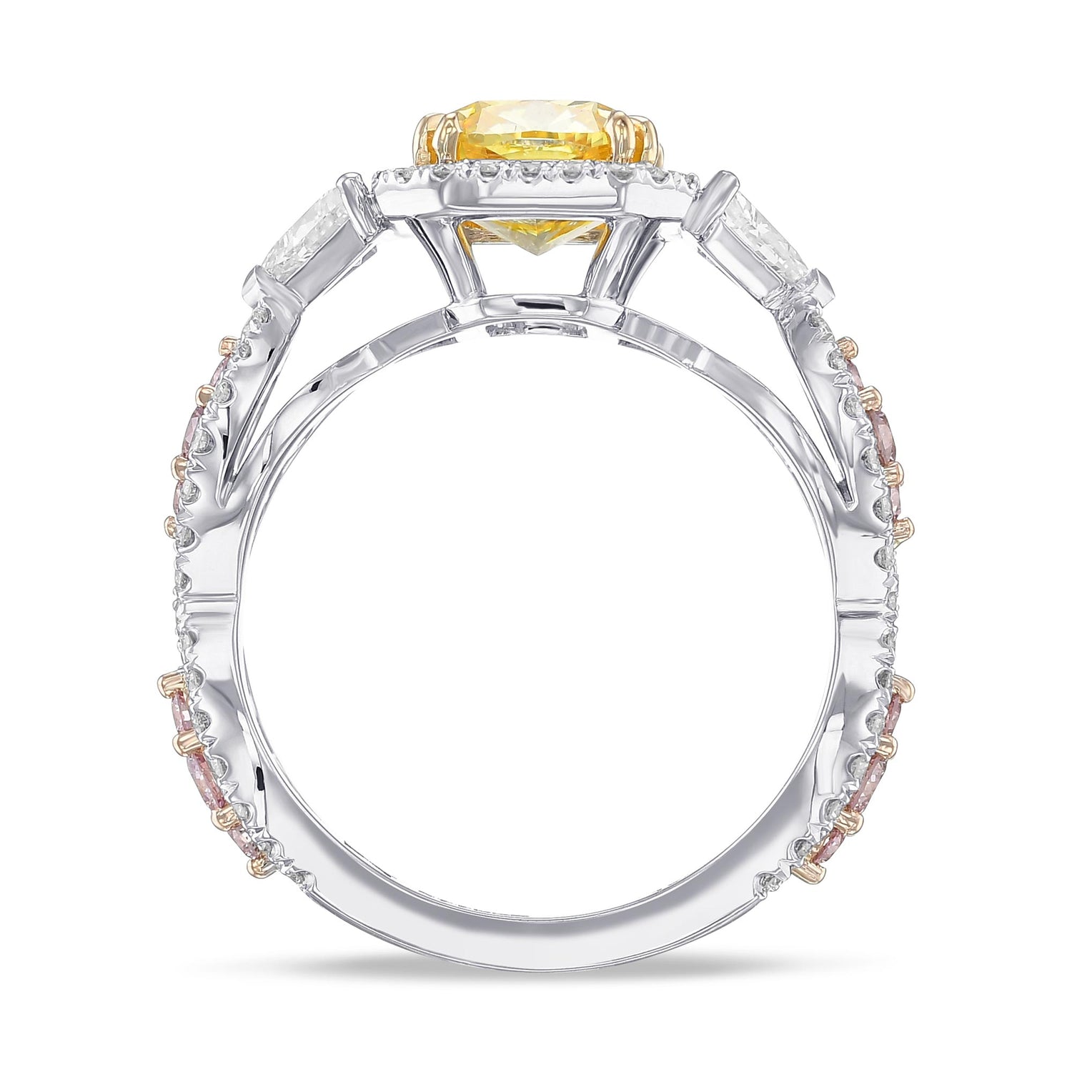 Grundpreis proA cross-over pave solitaire diamond ring setting, featuring a fancy intense yellow radiant diamond center stone. Mounted in 18K white & yellow gold.