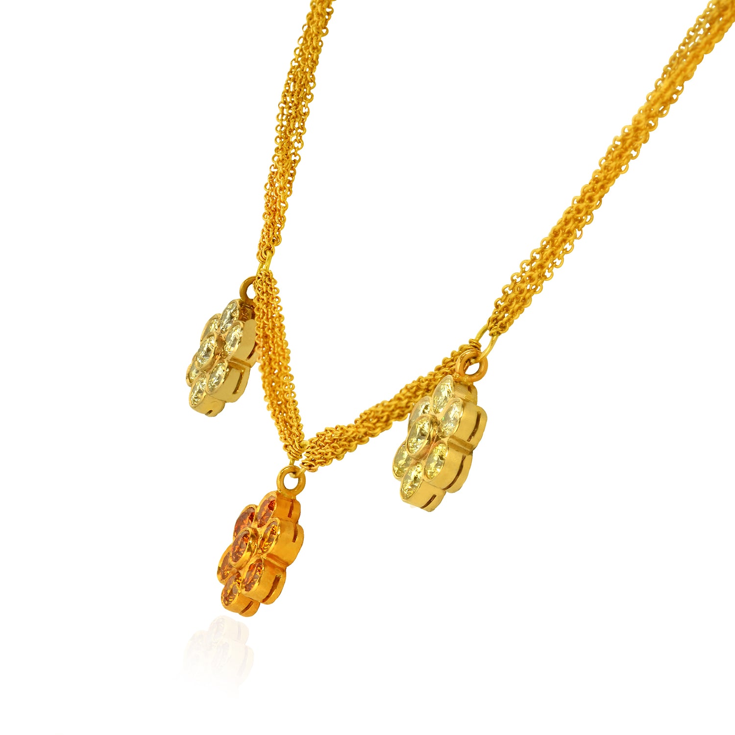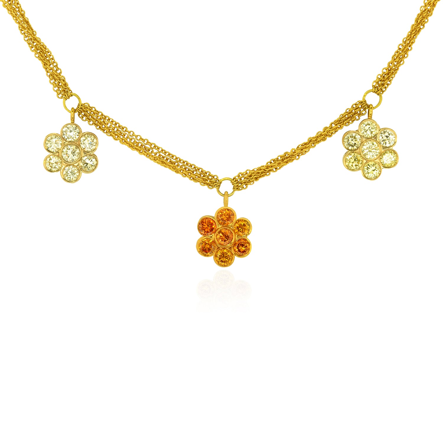 Grundpreis proAn artisan style pendant with a center fancy intense yellow cushion diamond weighing 1.01cts and certified by GIA. The pendant features collection color brilliants styled in a two tiered halo. The centerpiece is nestled on a gold lattice background which is embellished by scalloped edging with a diamond accent. The pendant is mounted in 18K yellow gold.