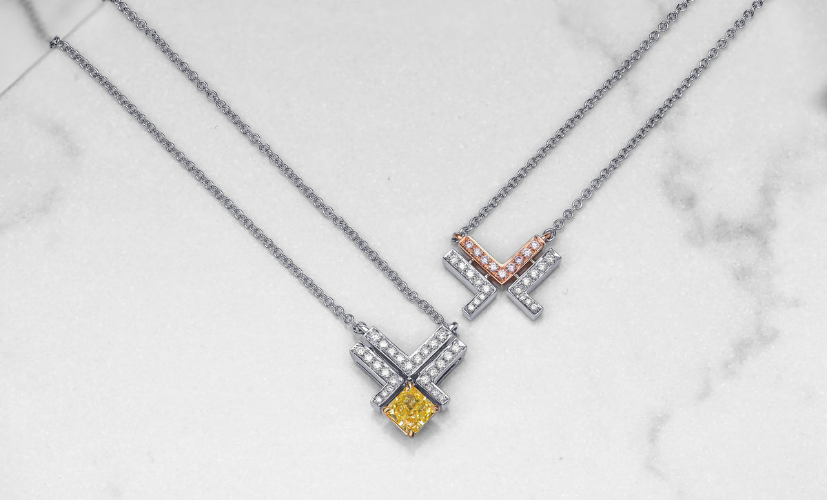 A sophisticated Fancy Pink and colorless round diamond pavé pendant in LEIBISH’s signature two-tone design, mounted in 18K white and rose gold.