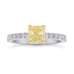 A fabulous GIA certified, 1.20 Carat (minimum weight) Fancy Yellow Cushion diamond ring, with pave set collection colorless diamonds along the shank. Mounted in 18K gold and styled with open pave setting style.