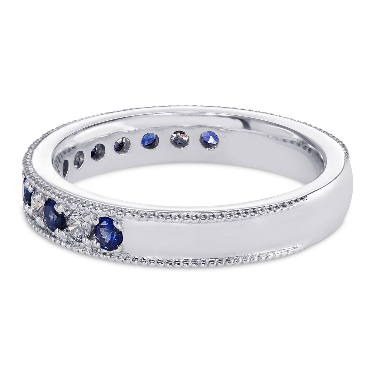 A beautiful sapphire and diamond band ring mounted in 18K white gold, with alternating round sapphire and collection color white round brilliant diamonds. The ring is finished with a milgrain edge. For more information about this item please contact our customer service department.
