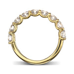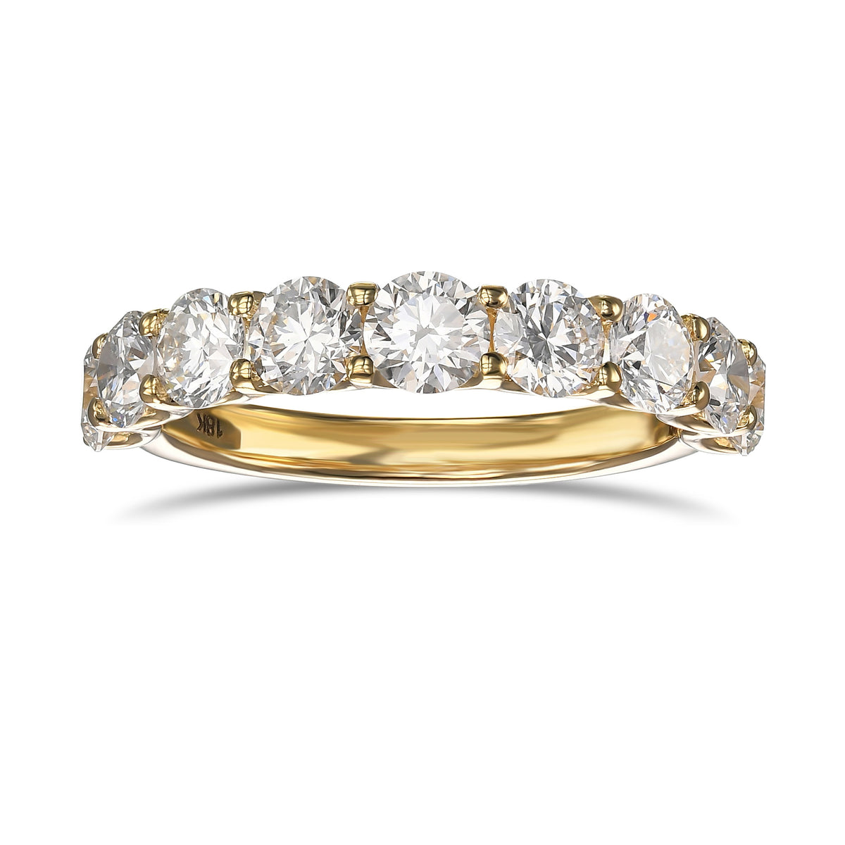 A classic round brilliant diamond band, featuring F color brilliants styled in a shared prong setting, and mounted in 18K yellow gold.
