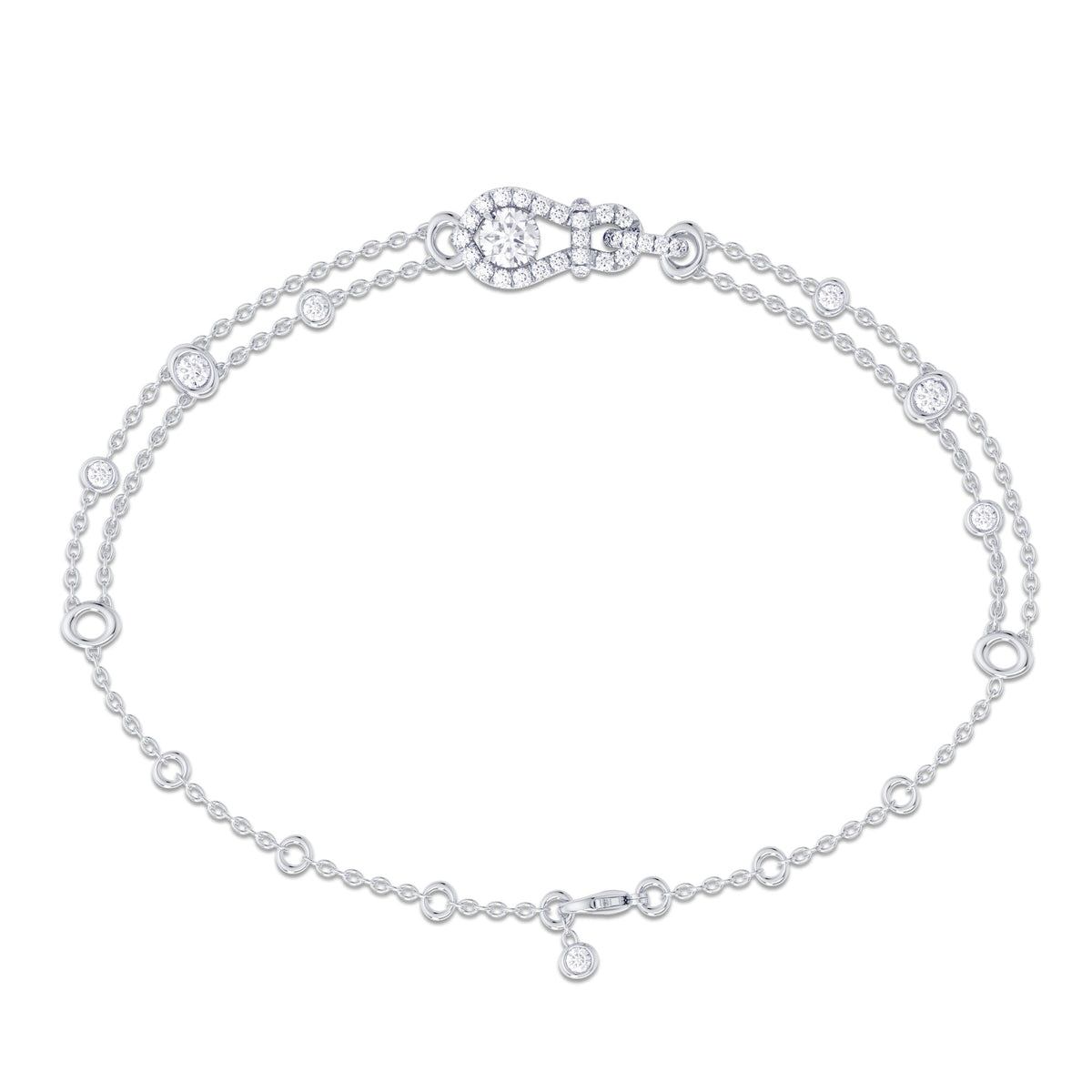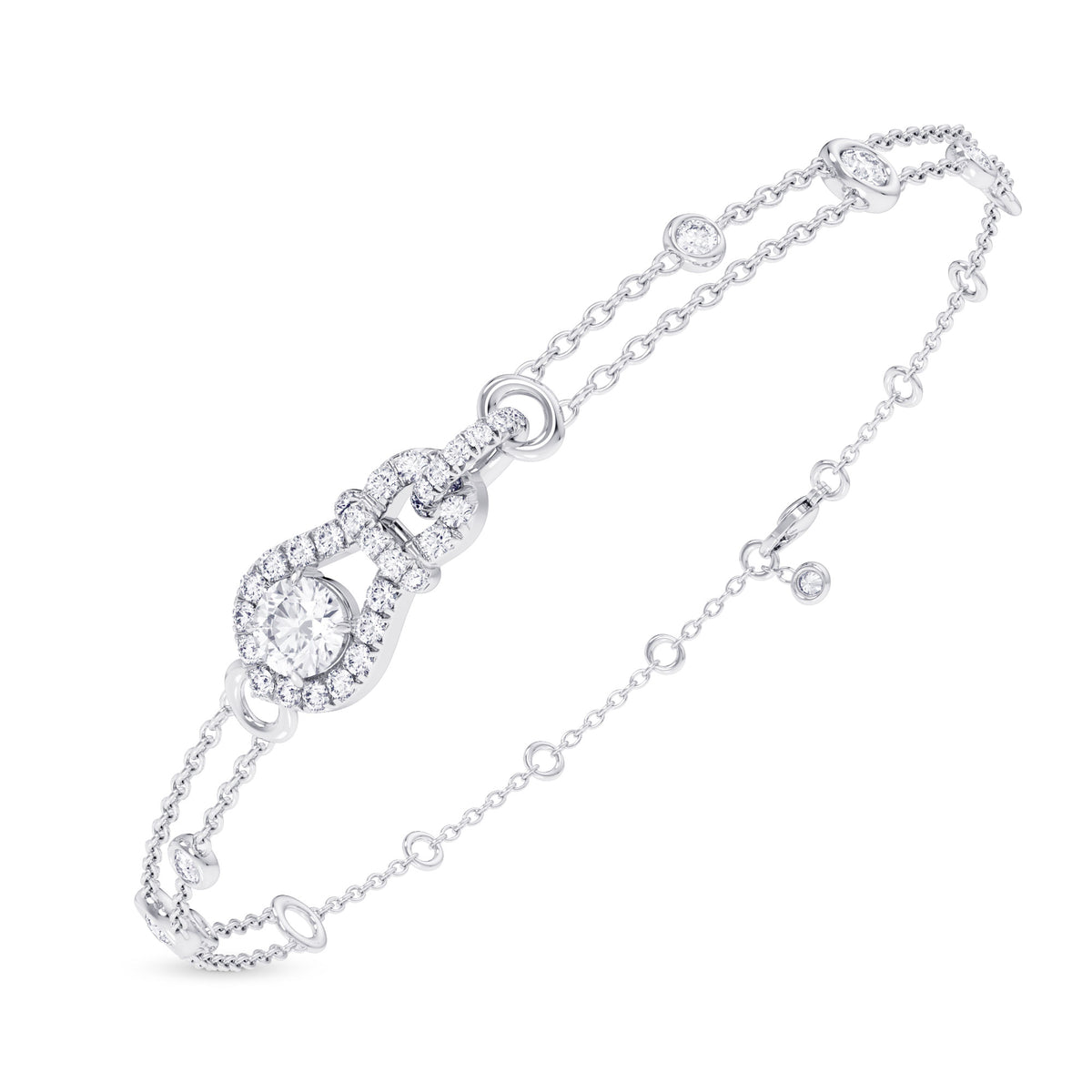 A delightful bracelet mounted in 18K White Gold with a Round Brilliant White Diamond Buckle feature styled in an Open Pave setting. The bracelet has a chain with interspersed diamonds styled in a Bezel setting, and locks with a lobster clasp .