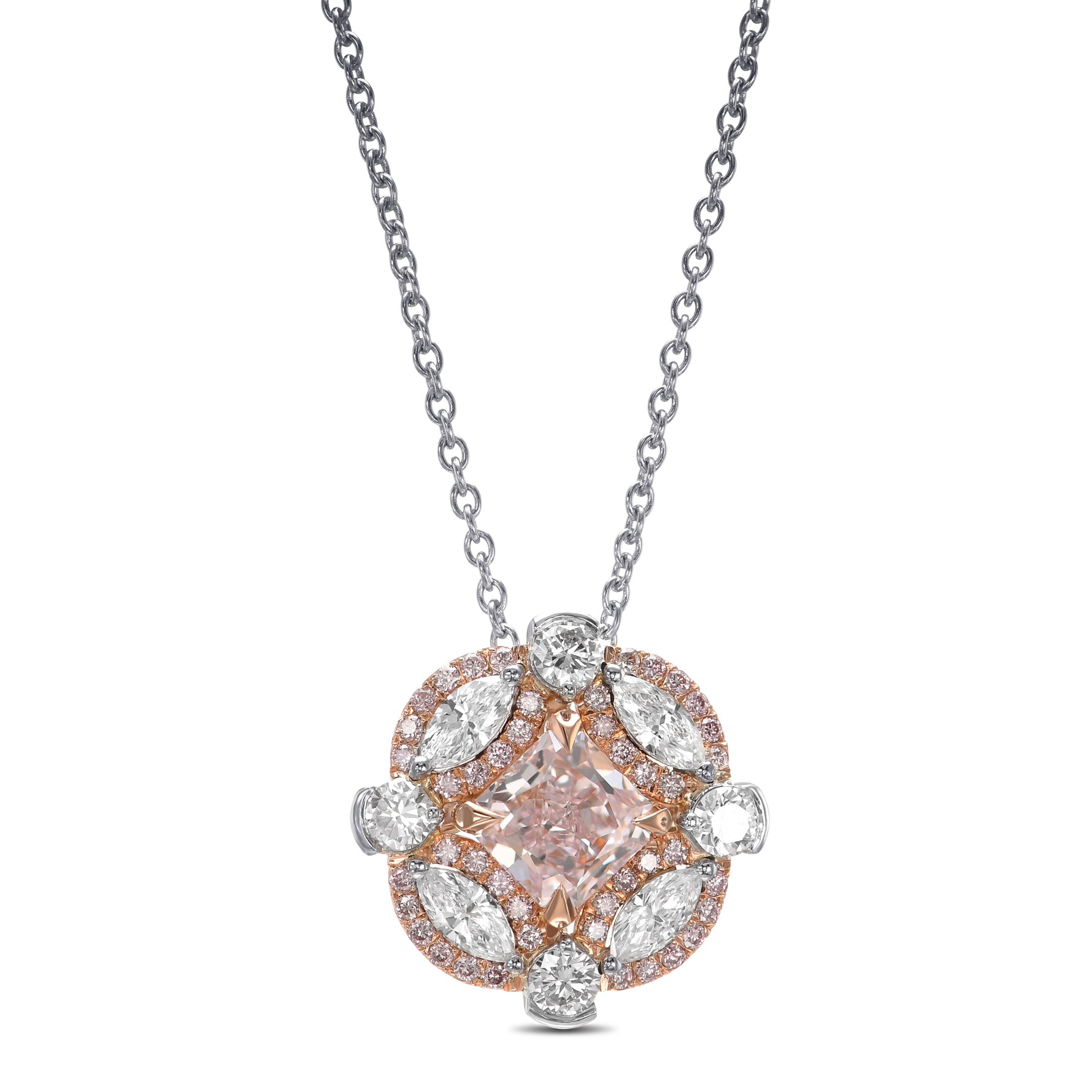 An extraordinary couture fancy light pink radiant diamond pendant with a center diamond weighing 0.86 and certified by GIA. It is accented with 4 F+ color marquise and brilliants, with fancy light pink brilliants styled in an open pave double halo. The pendant is mounted in platinum and 18K rose Gold.