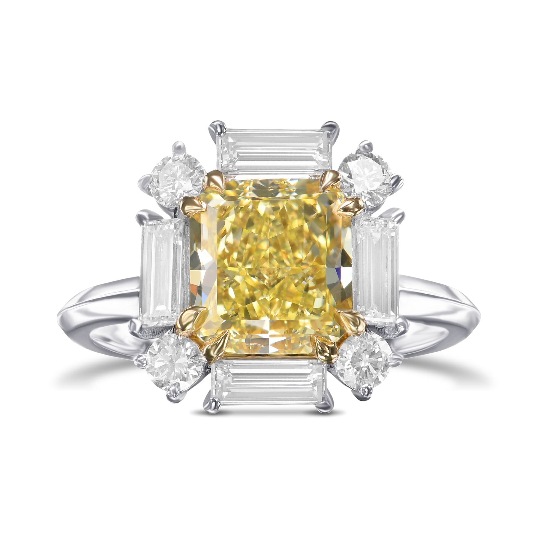 A beautiful fancy yellow cushion diamond halo ring which is part of our stunning Harmony collection, with the under gallery of the ring reflecting the Leibish logo. It has a center stone weighing 2.23cts and certified by GIA. The ring features collection color brilliants and baguettes, styled in a contemporary shared prong halo, and the ring is mounted in 18K white and yellow gold.