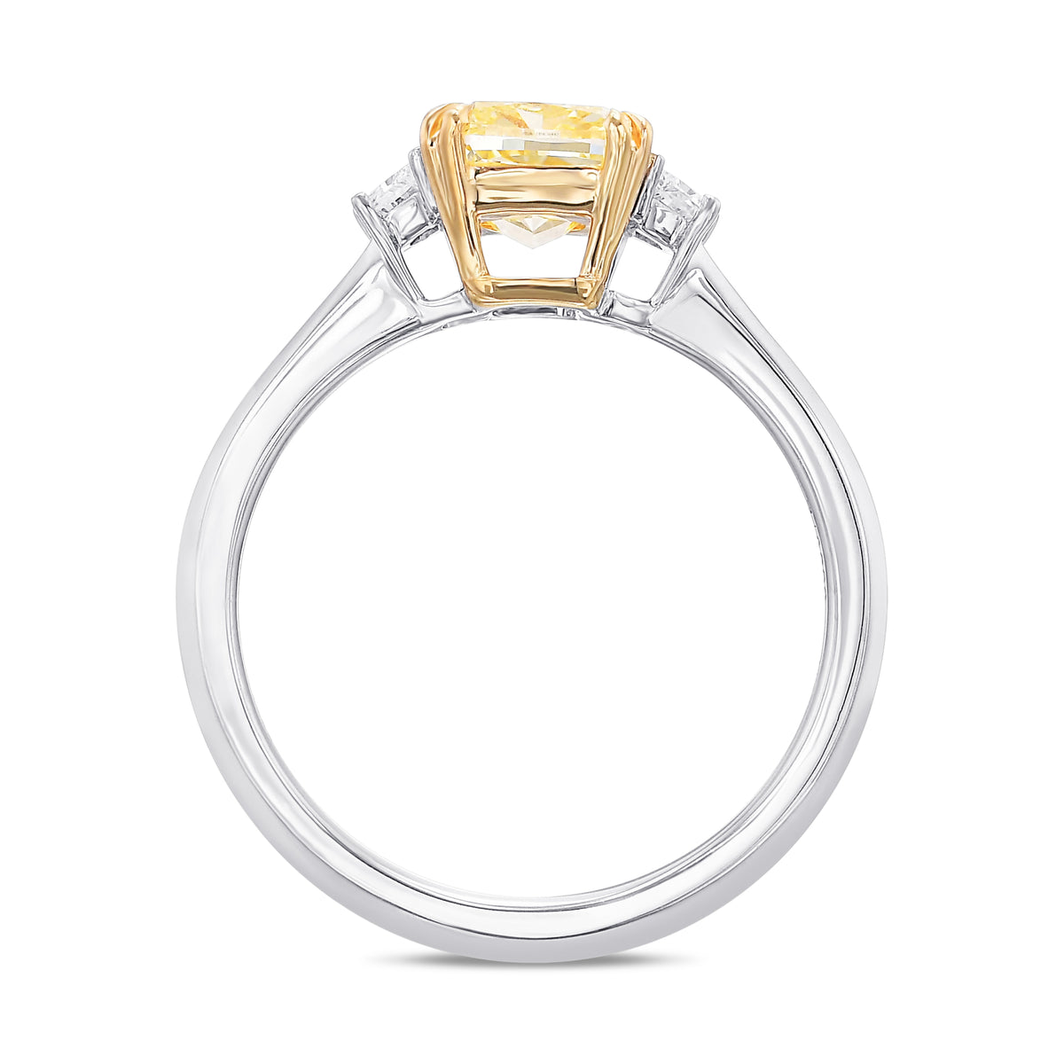 A classic fancy yellow cushion three-stone diamond ring, with a center stone weighing 1.50 carats certified by GIA. The ring, which is mounted in platinum and 18K yellow gold, is flanked with 2 F+ trapezoids with all diamonds set in a prong setting.