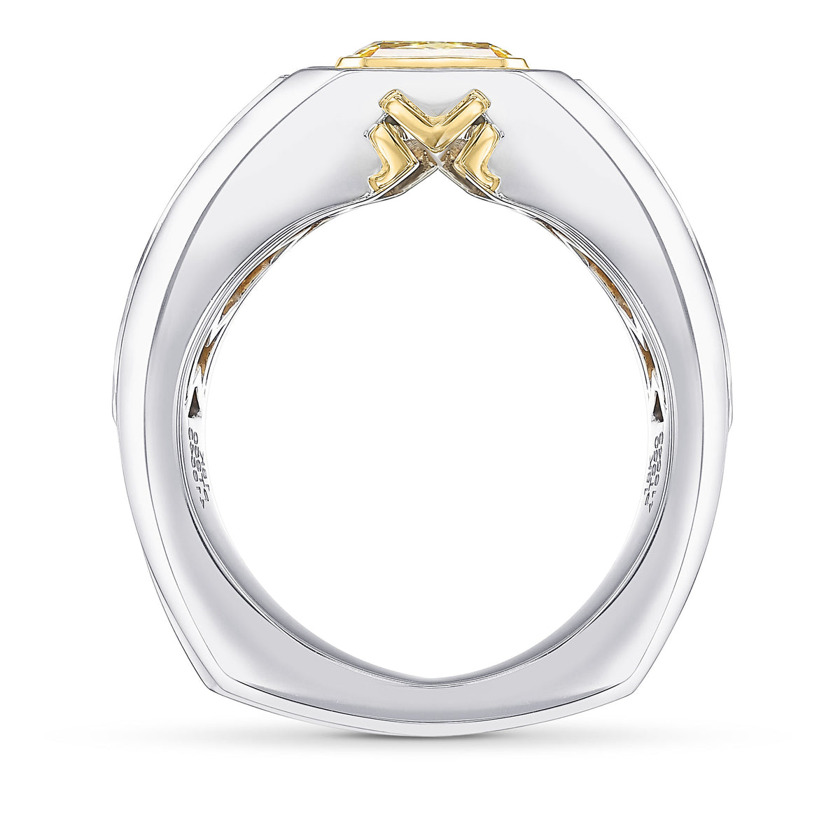A stunning Fancy Yellow Radiant diamond men's ring, with a center diamond weighing 1.11ct and certified by GIA. The diamond is accented by collection color Princess cut diamonds styled along the shank in a Chanel setting, and the ring is mounted in Platinum and 18k yellow gold.