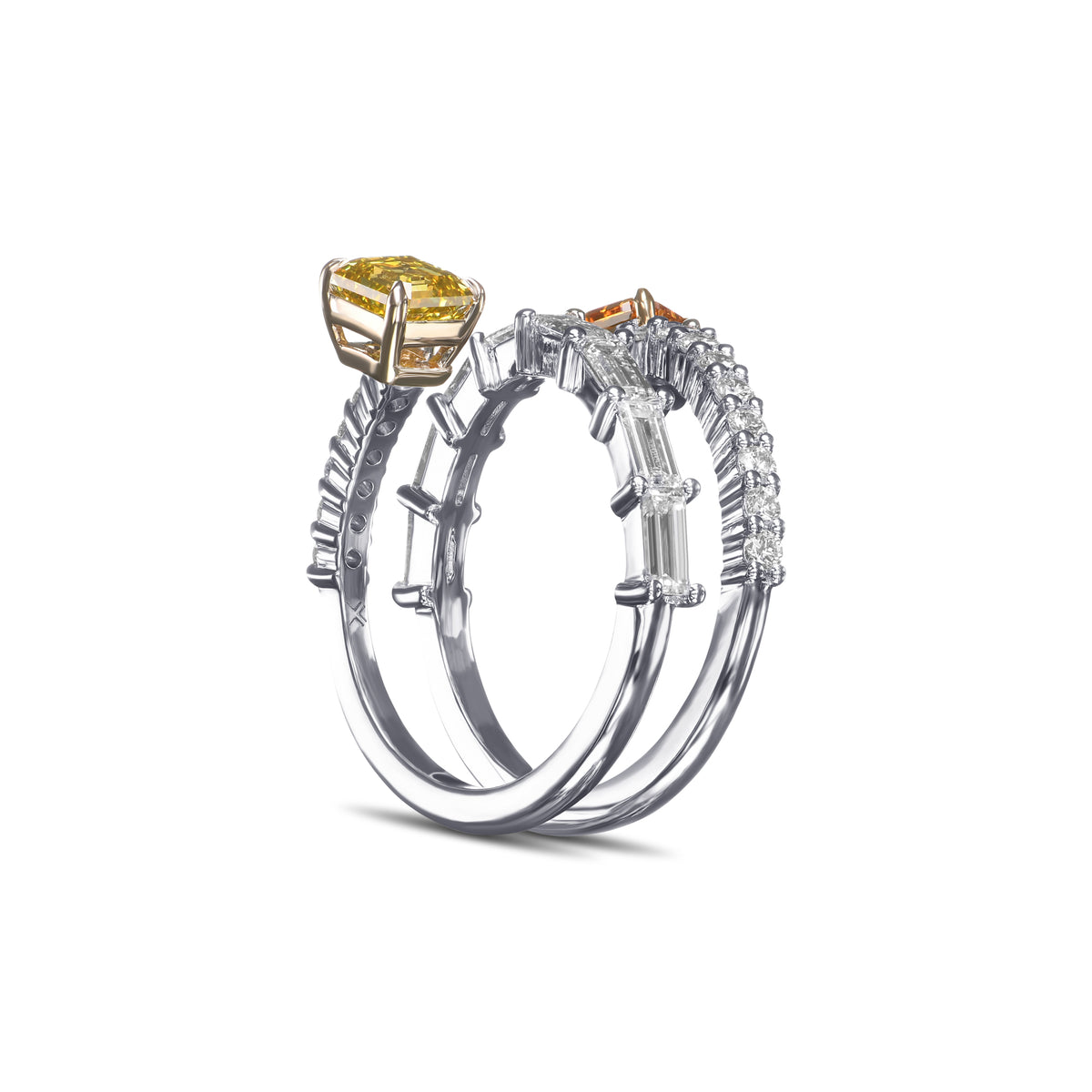 A fabulous mix color and mix shape diamond crossover ring, featuring two diamonds with a total weight 1.19cts and both certified by GIA. The stones are enhanced by a spiral band accented with collection color baguettes and brilliants, styled in shared prongs and mounted in 18K white and yellow gold.