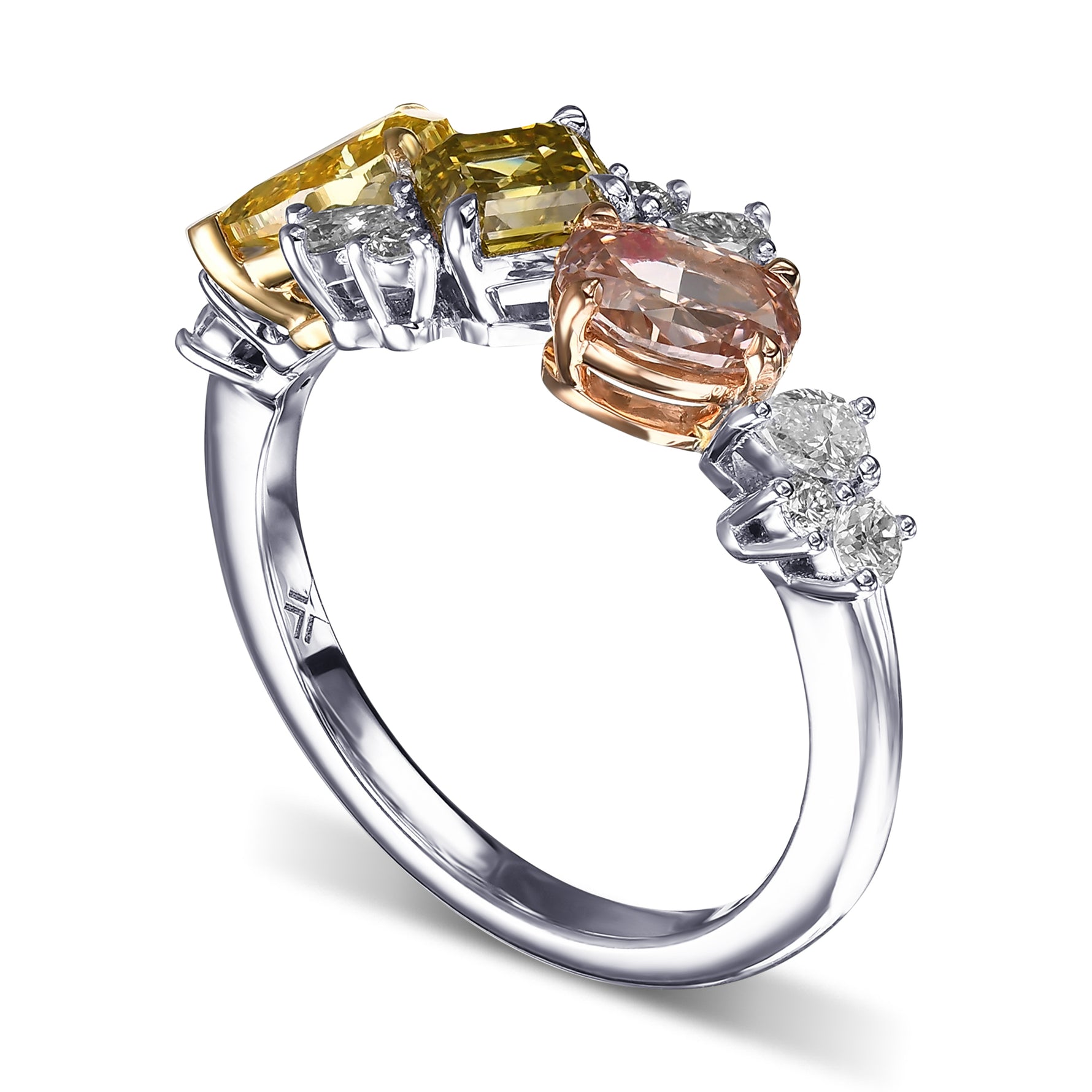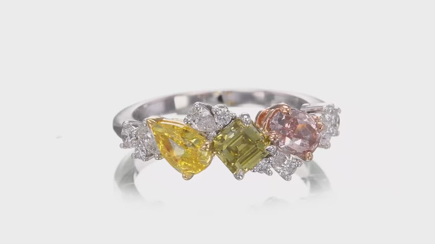 Inspired by nature, this beautiful cluster ring features shades of pink and yellow, oval, emerald and pear diamonds styled in an asymmetrical design and all certified�by GIA. These diamonds are accented by collection color pears and brilliants, all styled in prongs. Mounted in 18K white, yellow and rose gold.