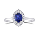 A classic Oval Sapphire and Diamond Halo Ring, with a center gemstone weighing 0.60cts and styled in a 4 prong setting. The ring features collection colors brilliants set in a Closed Halo, and the ring is mounted in 14K White gold.