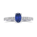 A classic Oval Sapphire Side-stone diamond ring with a center gemstone weighing 0.62cts. The ring features collection color brilliants side stones set in an open pave design, and is mounted in Platinum. Color and clarity graded by our in house GIA GG graduate gemologist.