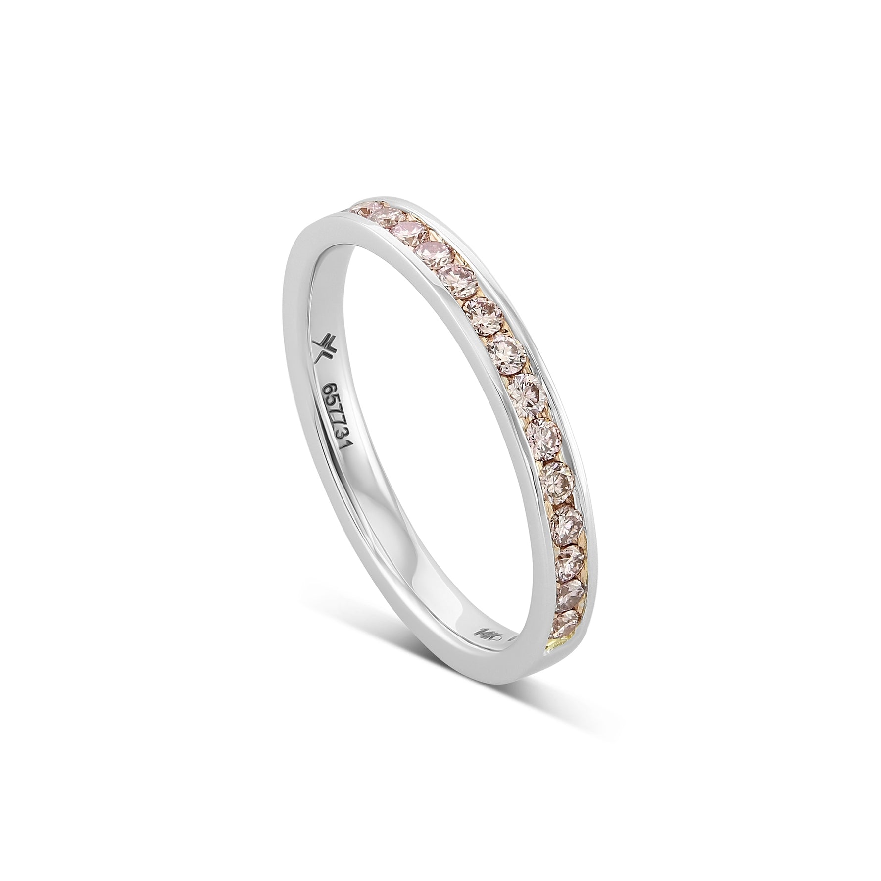 Round brilliant fancy pink diamond band ring, with 0.31cts stones styled in a channel setting and mounted in 14K white gold.