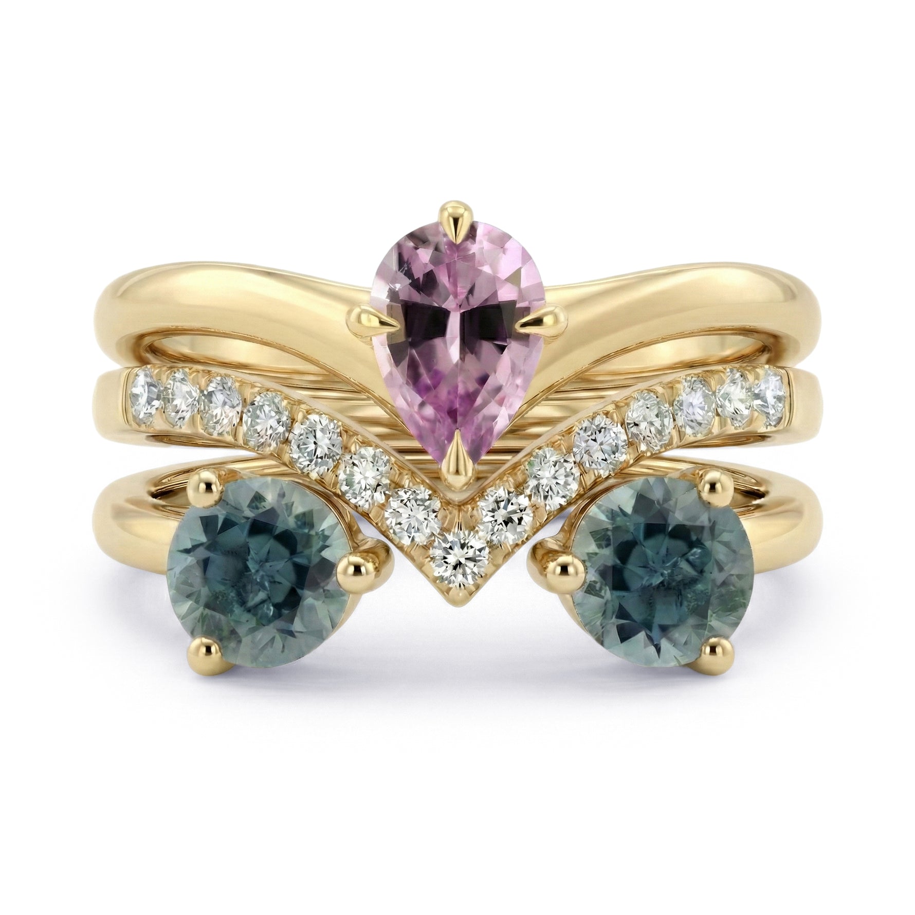 Pink Sapphire, Teal Sapphire & Diamond Trio Stack Rings