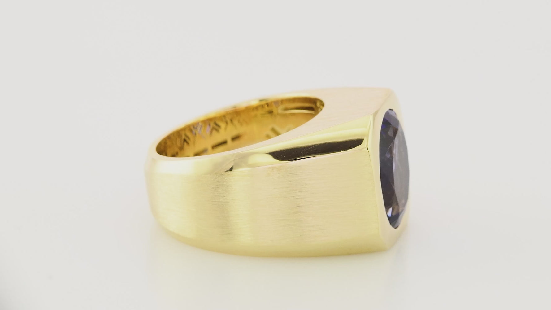 A beautiful men's solitaire violet blue Tanzanite pinky ring with a center oval gemstone weighing 5.92cts and mounted in 14K yellow gold.