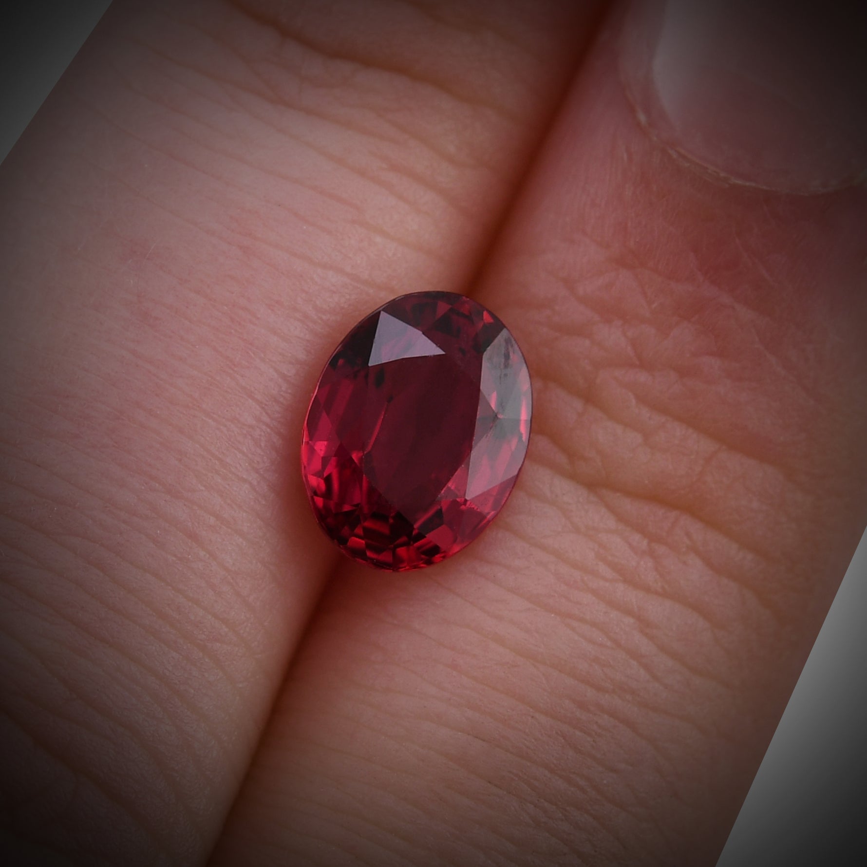 A stunning 2.03 carat Mozambique ruby in vivid red, oval-cut and CD-certified. This gemstone delivers exceptional brilliance and deep color saturation characteristic of premium rubies.