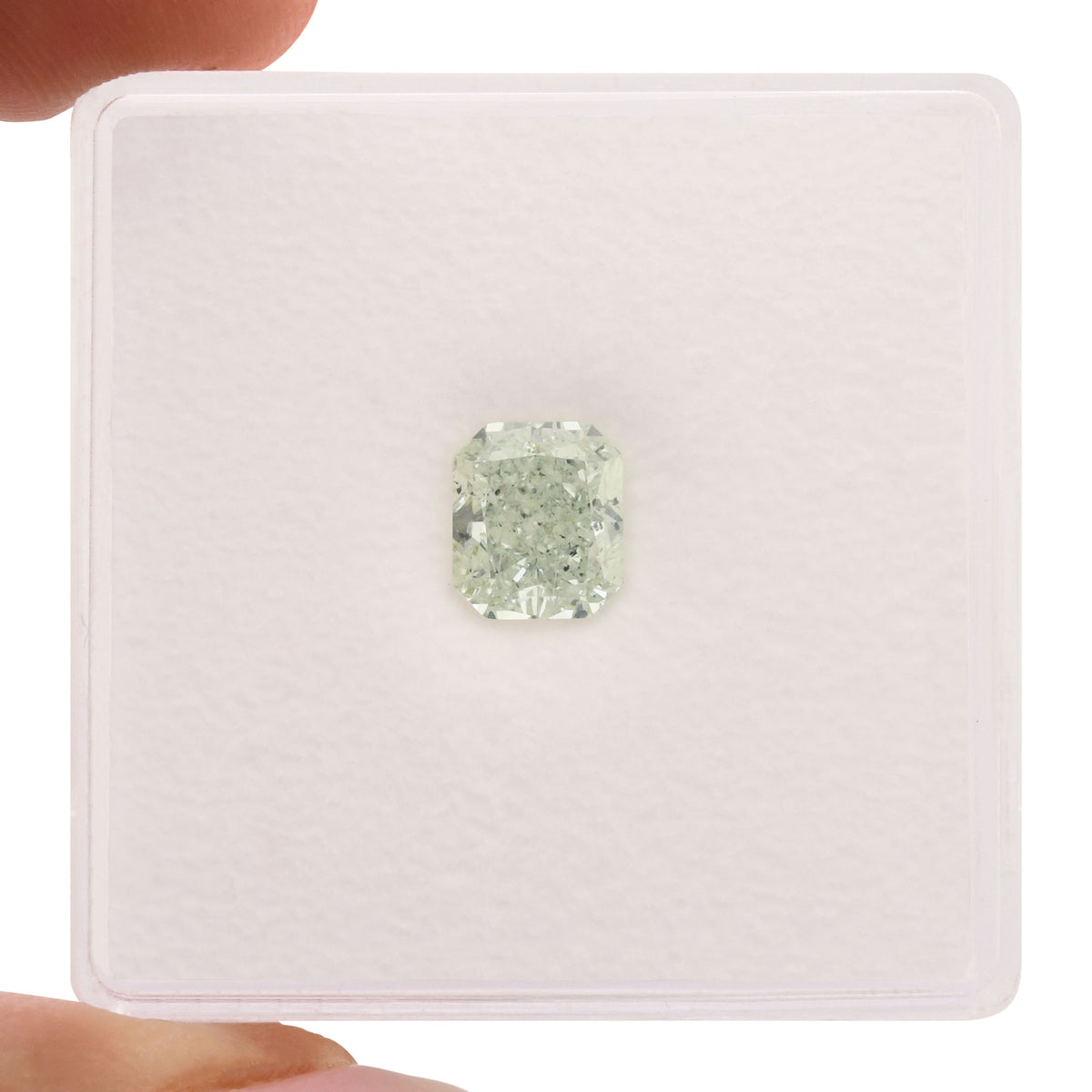 A 1.01-carat radiant diamond with a distinctive light green hue, graded SI2 by GIA. This beautifully proportioned stone delivers brilliant sparkle and offers a sophisticated choice for custom jewelry designs.