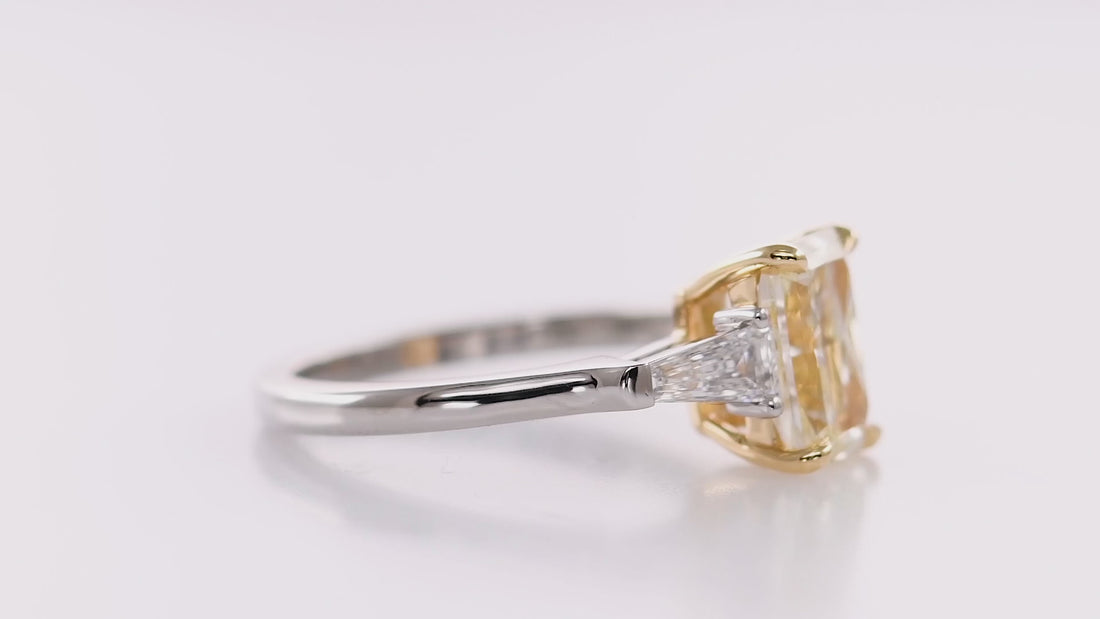 This distinguished three-stone diamond ring showcases a remarkable 2.02-carat radiant center diamond in a rare light yellow W-X color, certified by GIA for its authenticity and quality. It is elegantly accented by two taper diamonds in matching collection colors, enhancing the ring's brilliance and symmetry. Expertly set in a combination of platinum and 18K yellow gold, this piece offers a refined balance of strength and luxury.