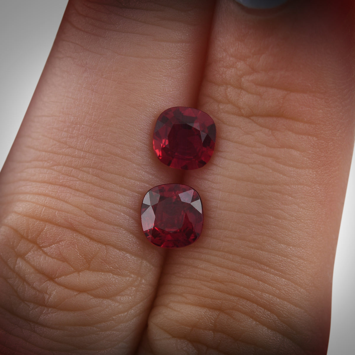 This pair of 1.86 carat Mozambique cushion rubies features a deep red color and excellent clarity, ideal for refined jewelry pieces demanding exceptional quality.