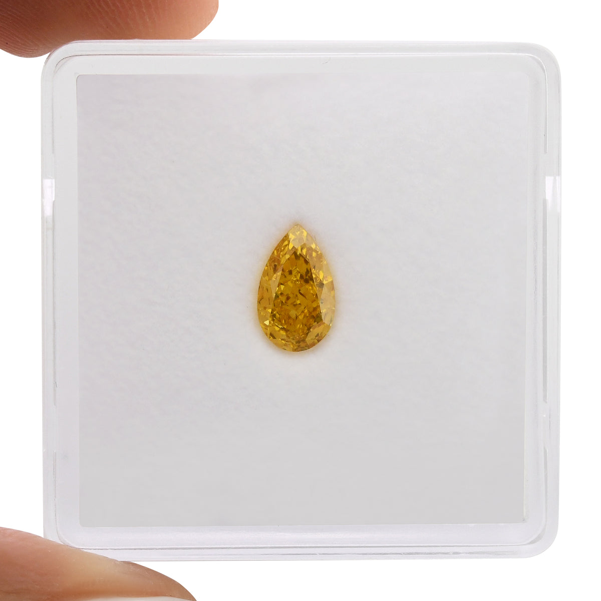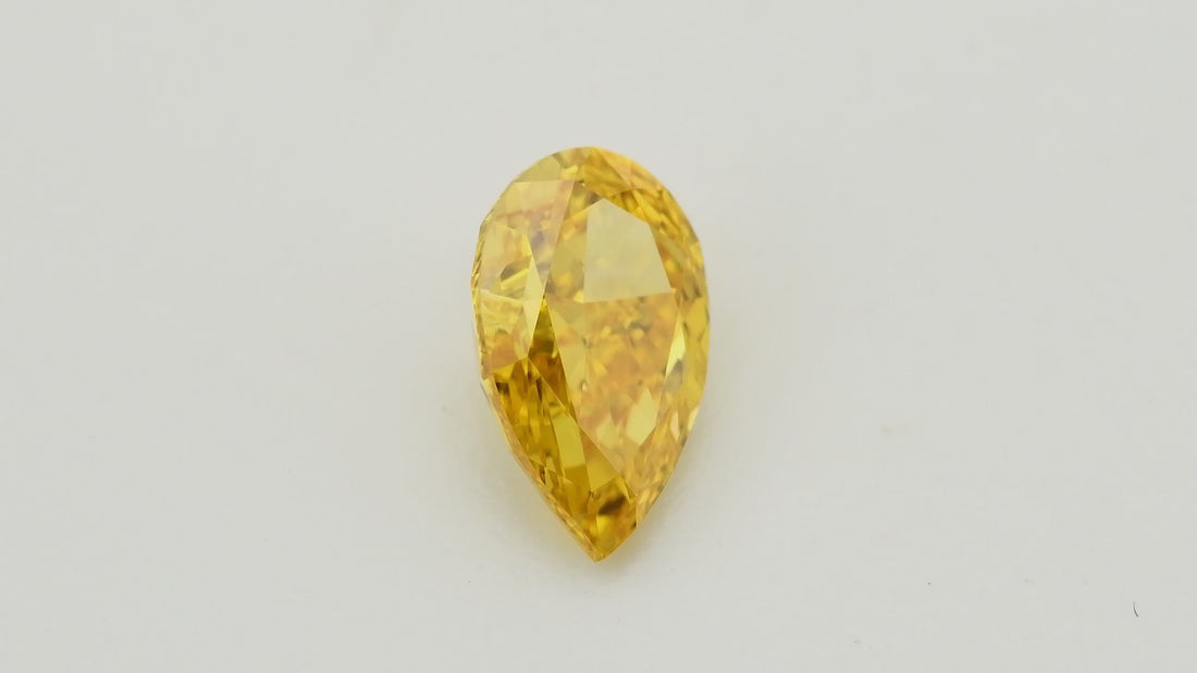 This 0.61 carat pear-shaped diamond features a vibrant Fancy Vivid Yellow Orange hue with VS1 clarity, certified by GIA. Its exceptional sparkle is enhanced by very good polish and symmetry, making it a striking choice for fine jewelry.