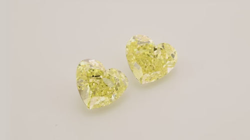 A stunning pair of 2.01-carat Fancy Yellow heart diamonds, GIA certified SI2. These warm golden stones are perfect for creating a unique engagement ring or custom jewelry piece. Heart shapes symbolize love, while their vibrant yellow hue brings timeless elegance and sophistication to any design.