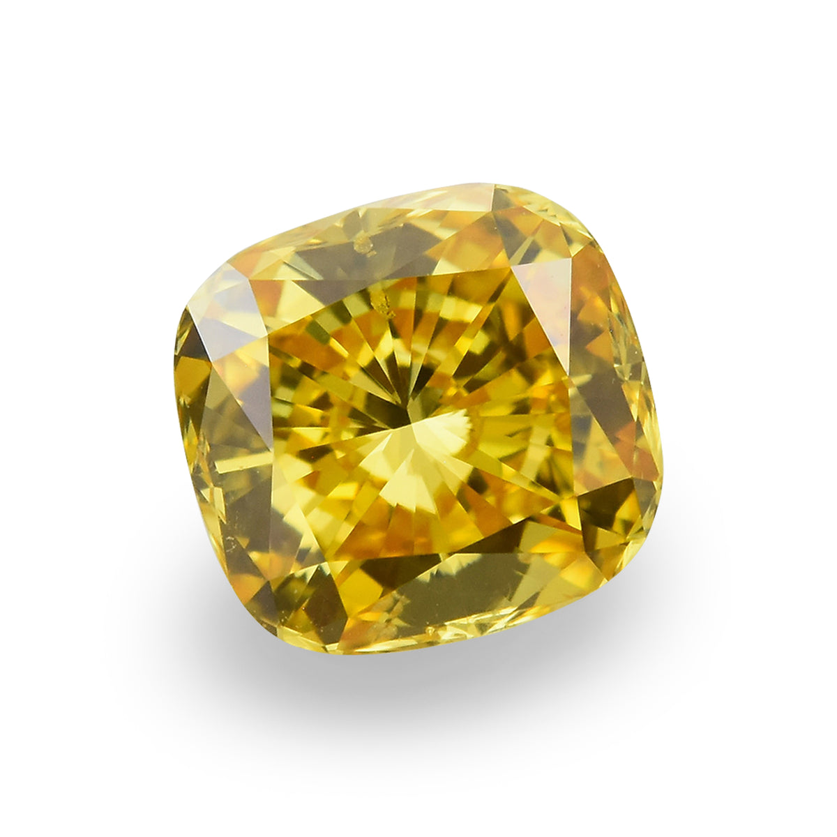 0.41 carat, Fancy Vivid Orangy Yellow, Cushion Diamond with SI2 clarity, graded by GIA. A splendid yellow diamond with a captivating golden color saturation. Clarity graded by our in house GIA GG Graduate Gemologist.